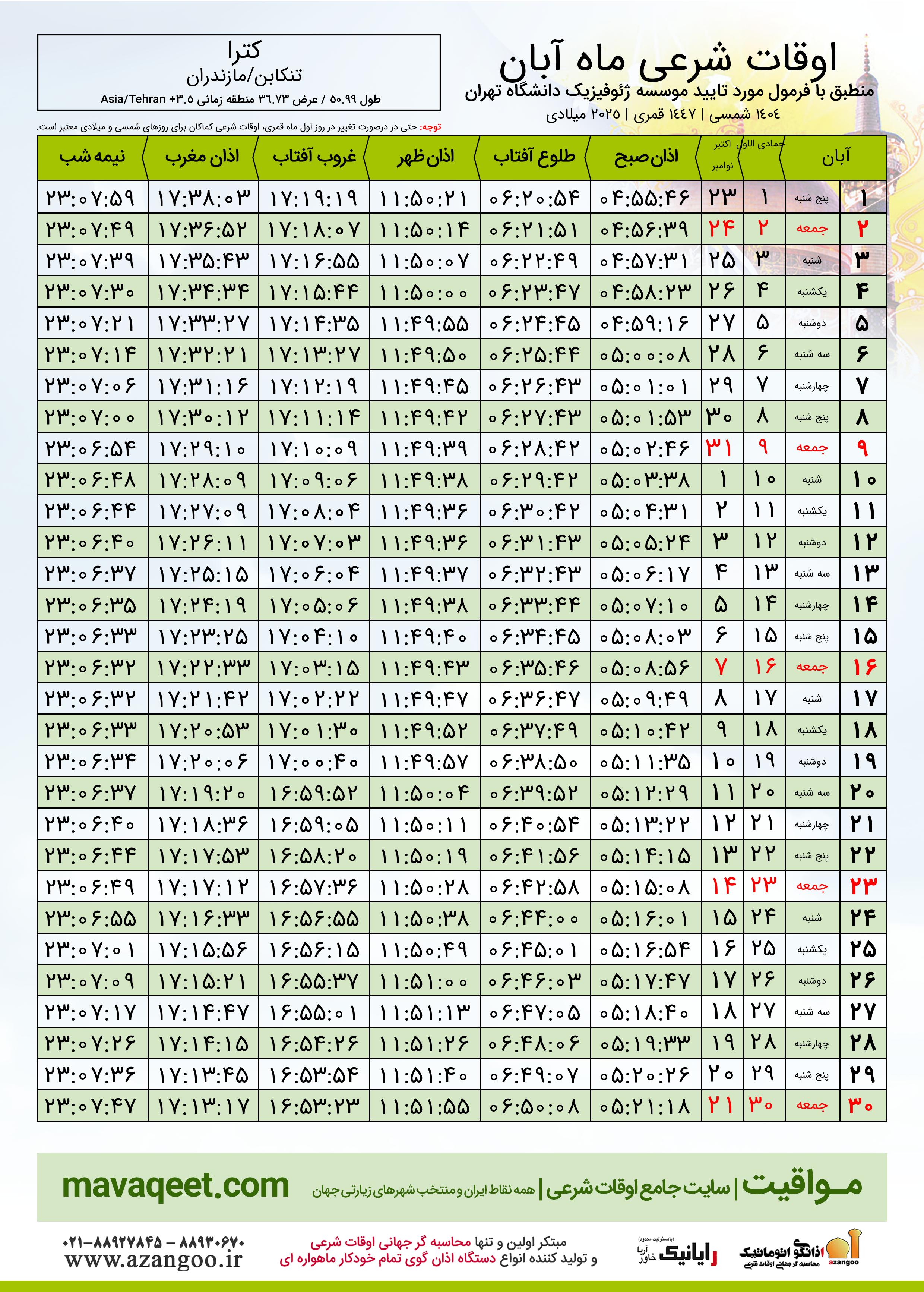 جدول اوقات شرعی آبان ١٤٠٤ شمسی شهر کترا
