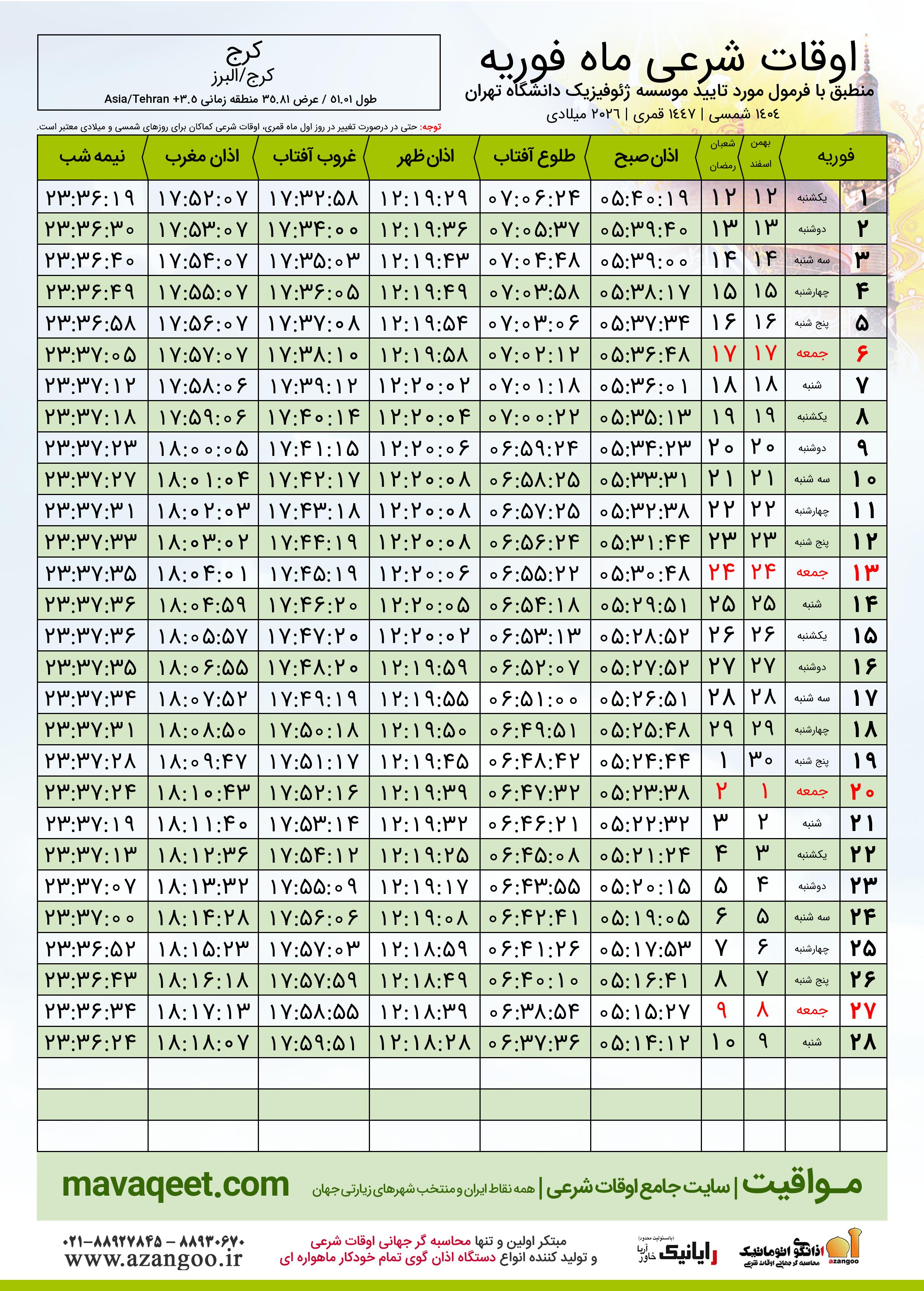 دانلود اوقات شرعی ماه رمضان ٠٤ - ١٤٠٤ شمسی | ٢٠٢٦ میلادی | ١٤٤٧ قمری شهر کرج