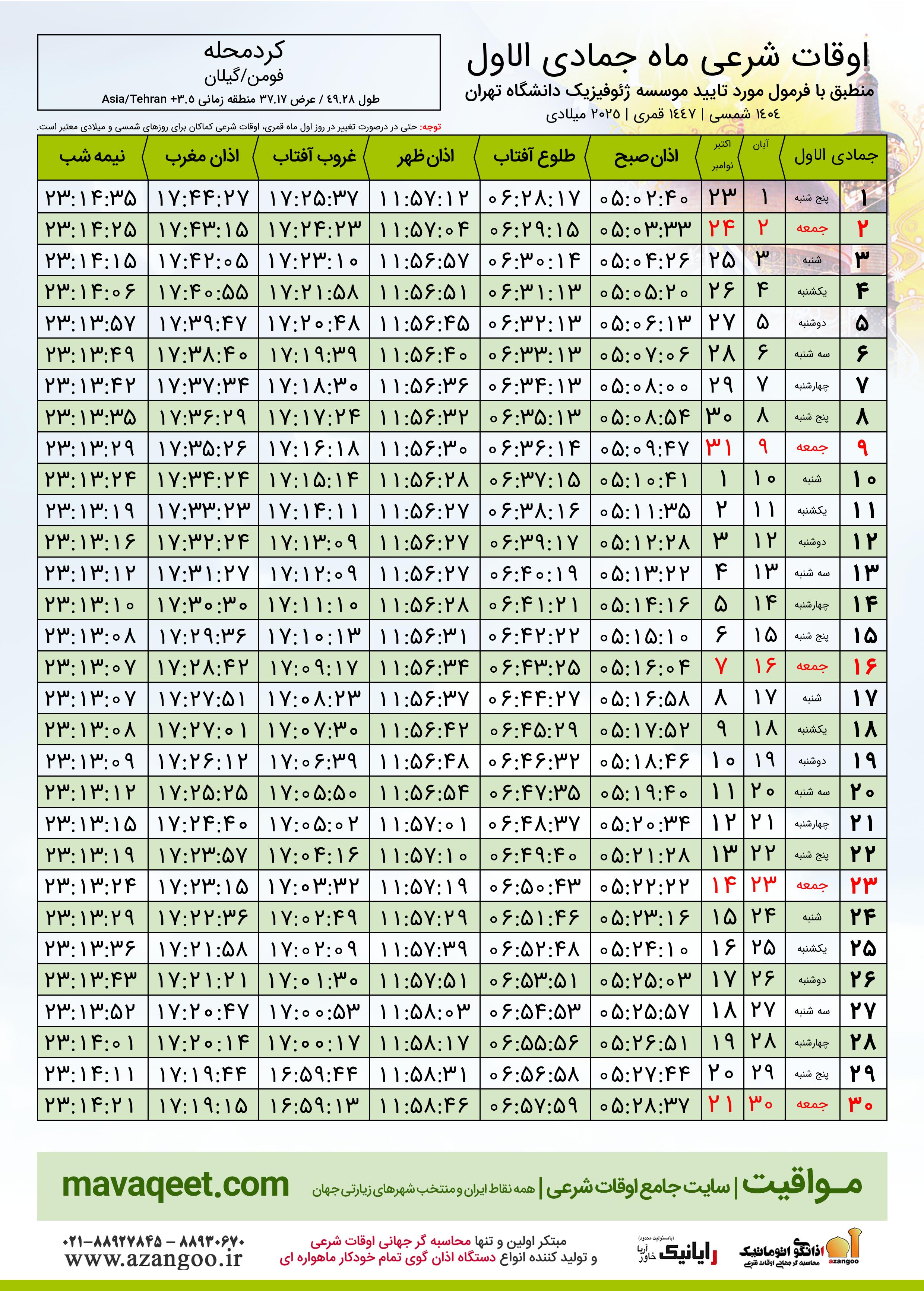 اوقات شرعی ماه جمادی الاول ١٤٤٧ هـ.ق شهر کردمحله بر