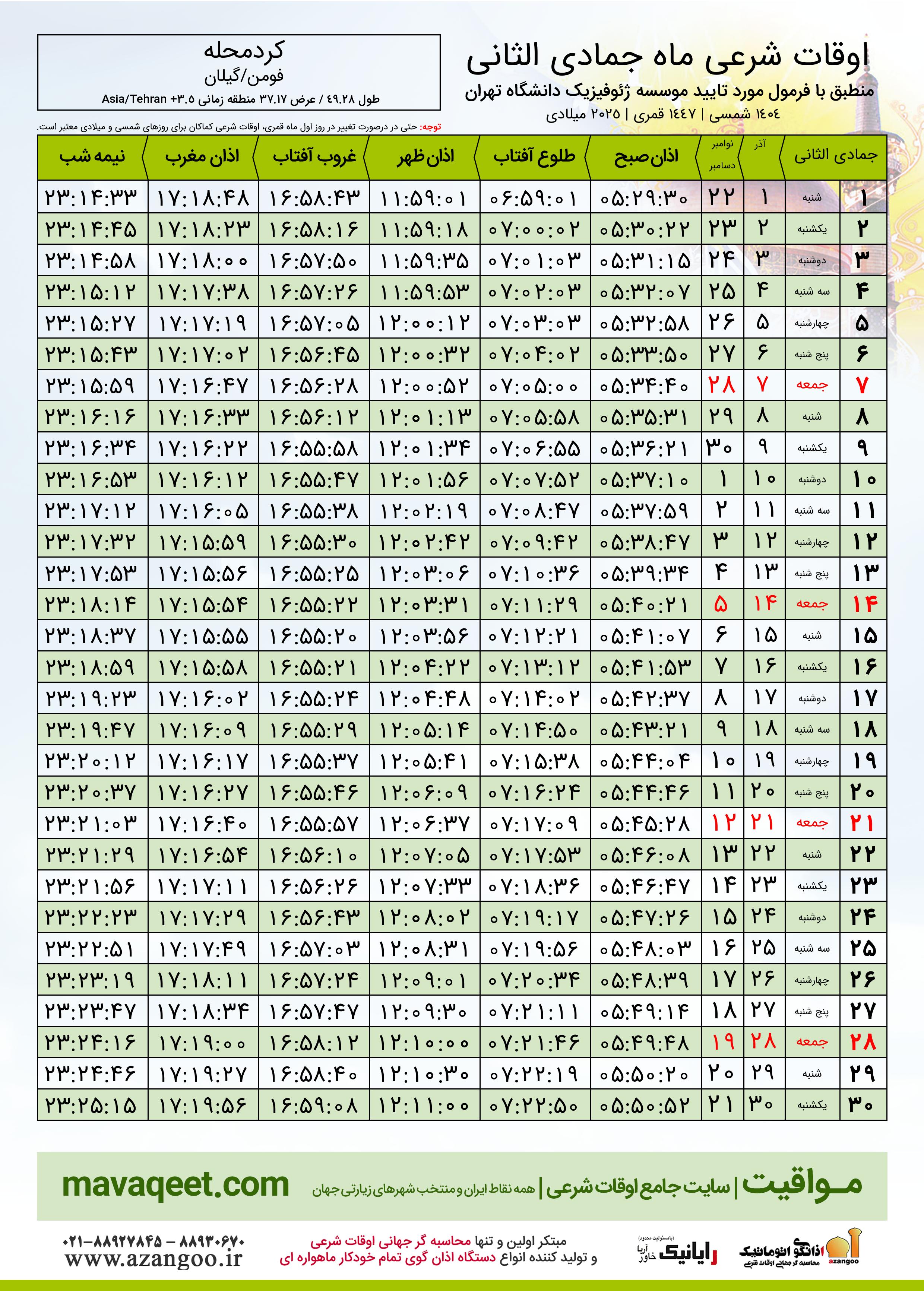 جدول اوقات شرعی جمادی الثانی ١٤٤٧ قمری شهر کردمحله