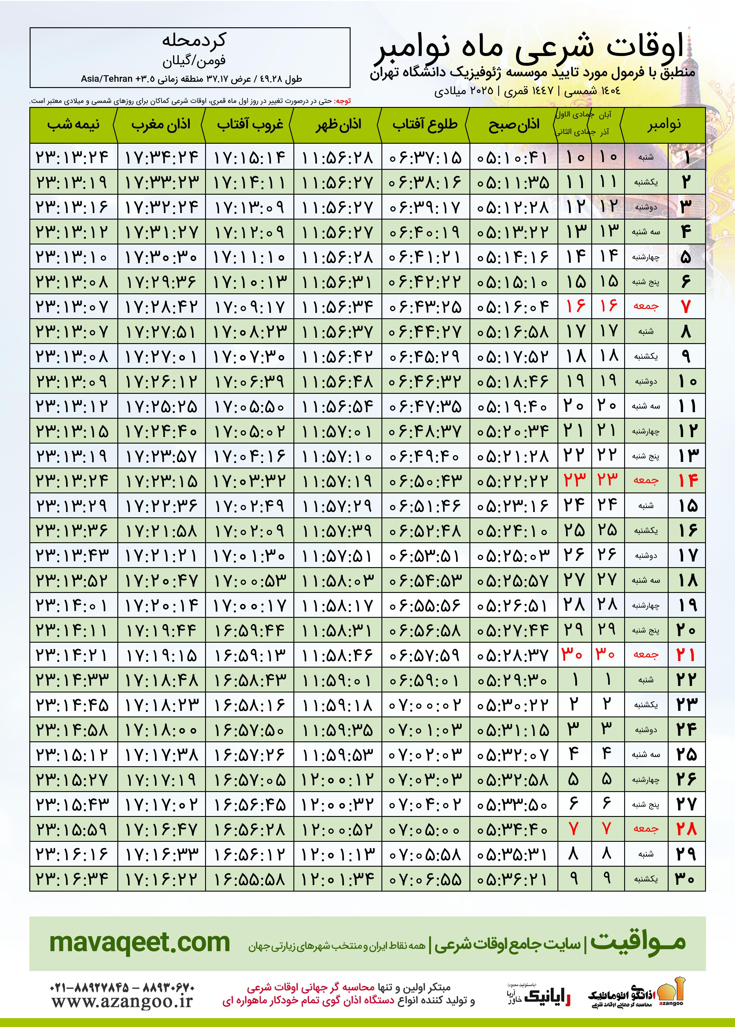 اوقات شرعی نوامبر ٢٠٢٥ میلادی شهر کردمحله