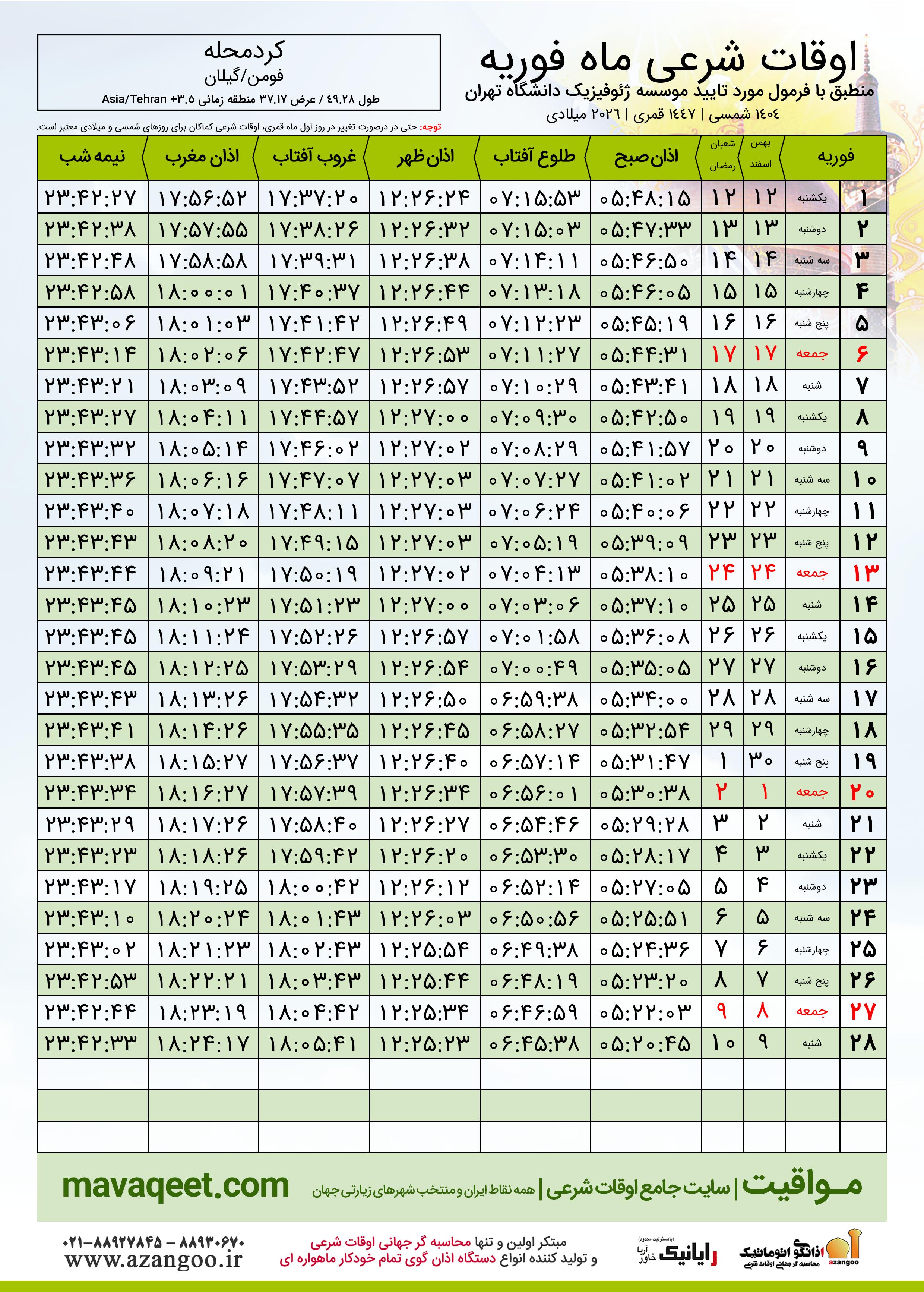 اوقات شرعی فوریه ٢٠٢٦ میلادی شهر کردمحله