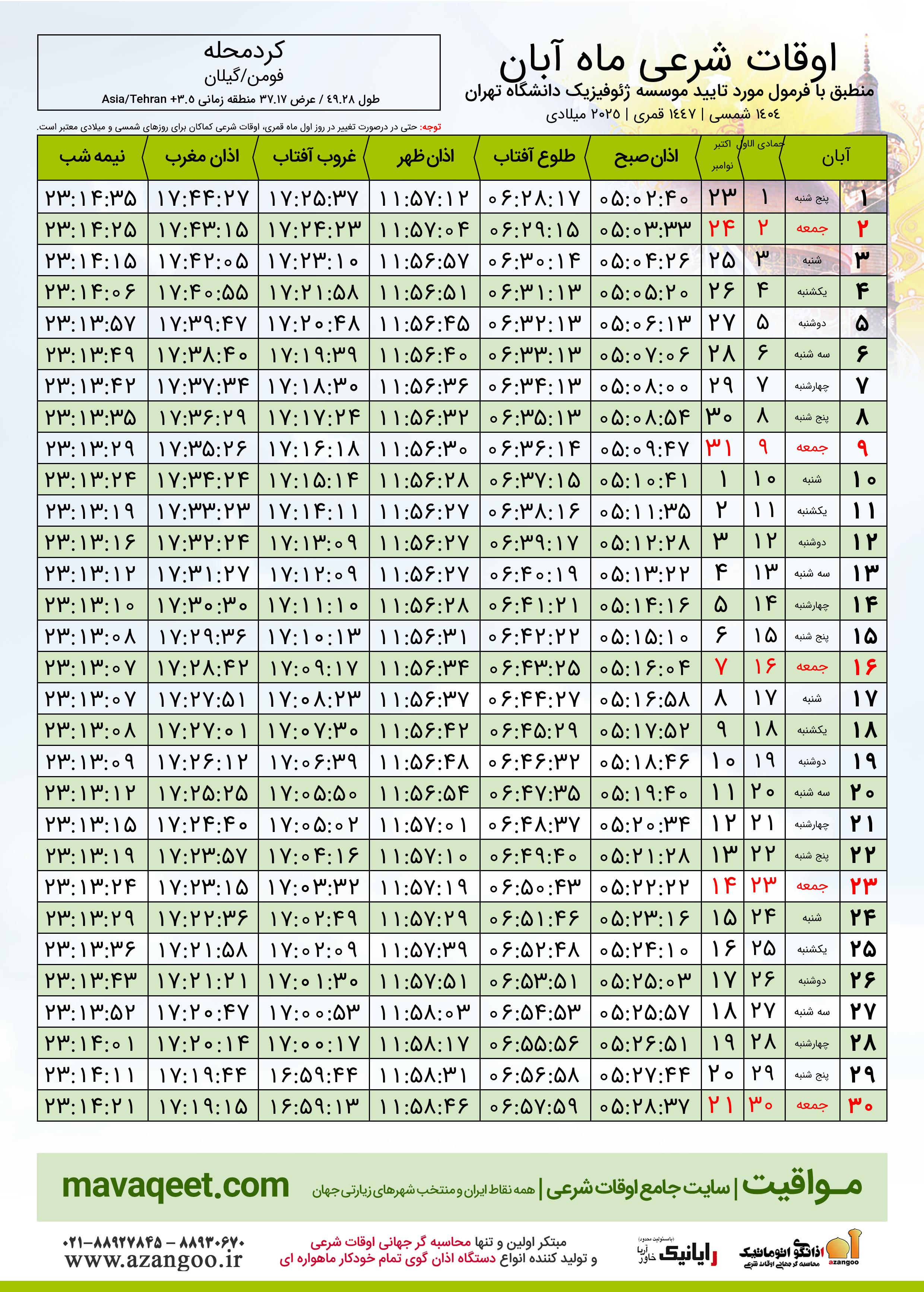 جدول اوقات شرعی آبان ١٤٠٤ شمسی شهر کردمحله