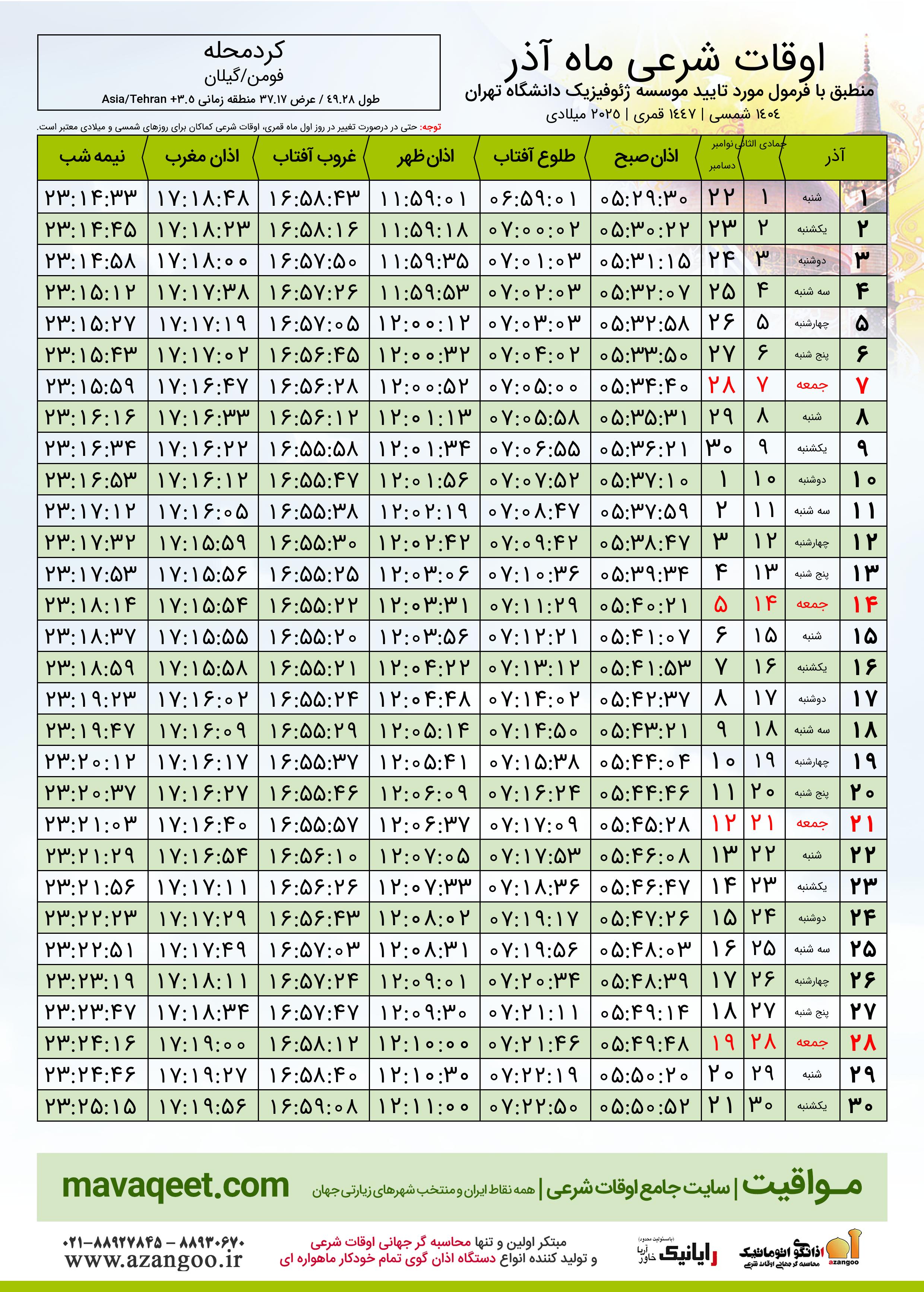 جدول اوقات شرعی آذر ١٤٠٤ شمسی شهر کردمحله