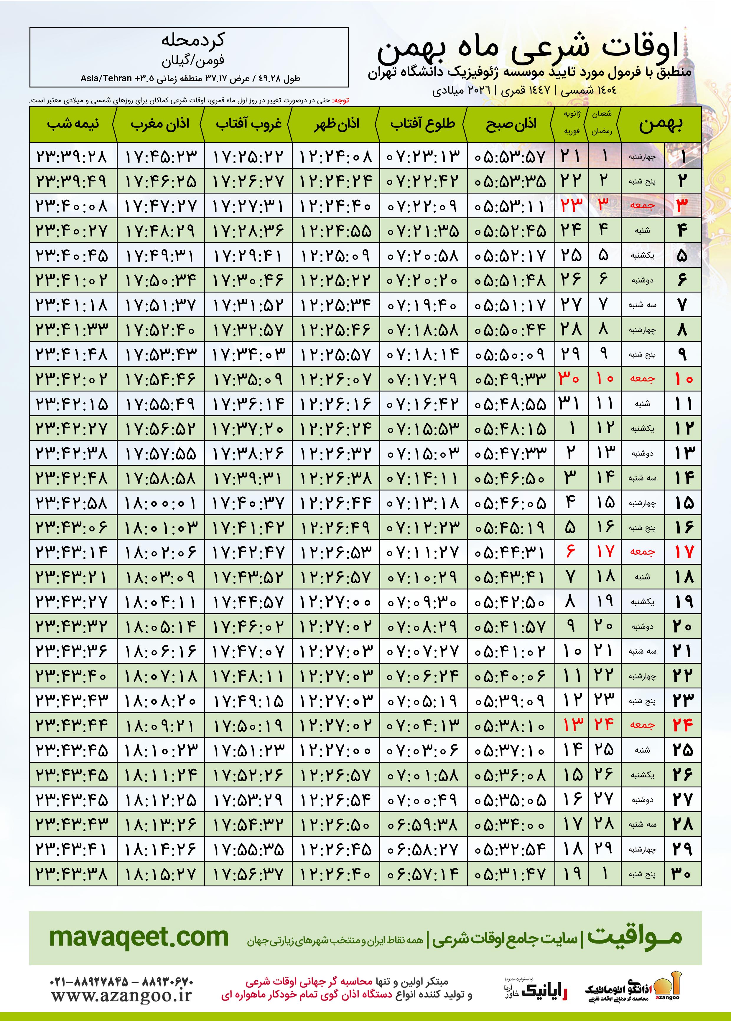 دانلود اوقات شرعی بهمن ٠٤ - ١٤٠٤ شهر کردمحله