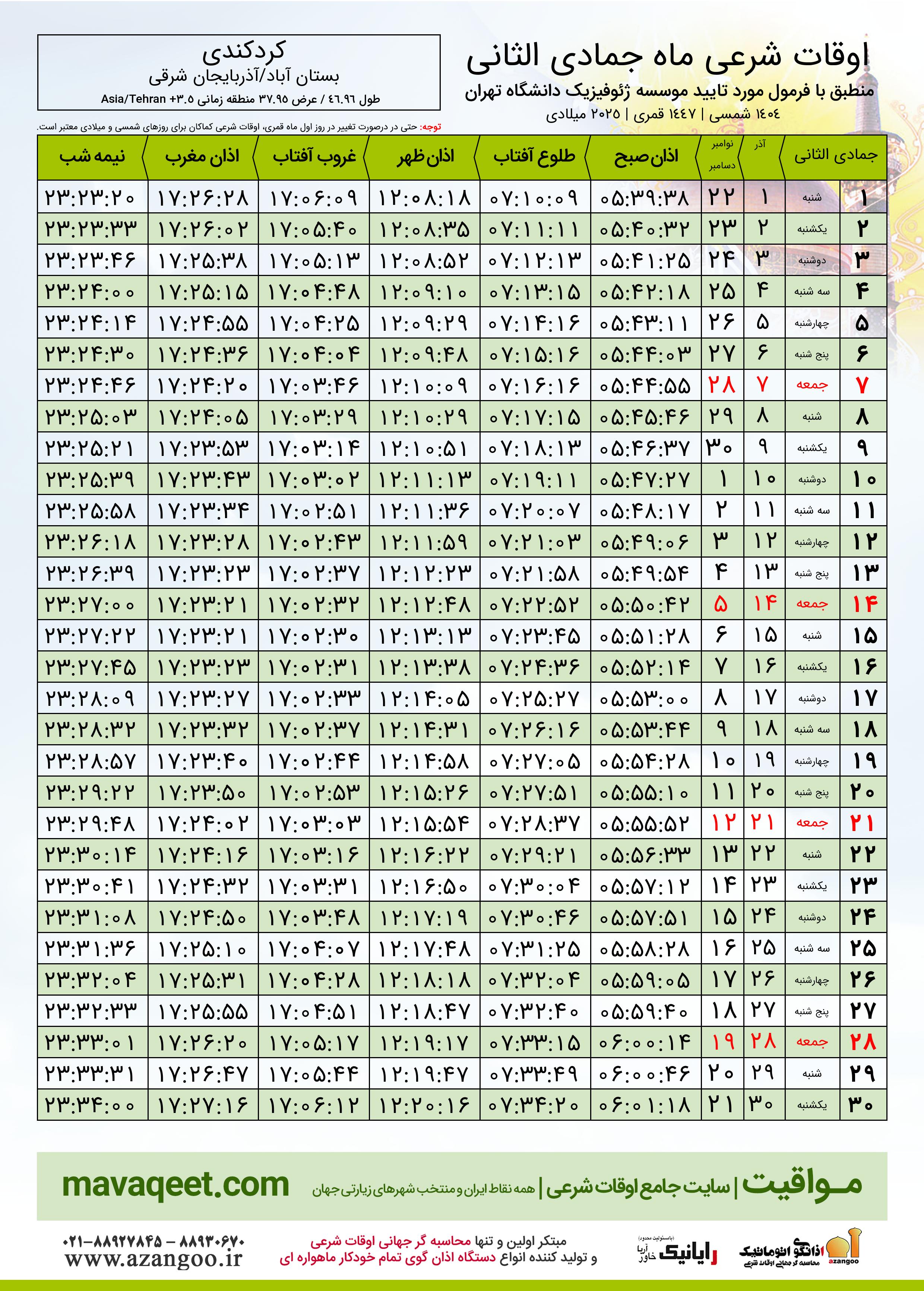 جدول اوقات شرعی جمادی الثانی ١٤٤٧ قمری شهر کردکندی