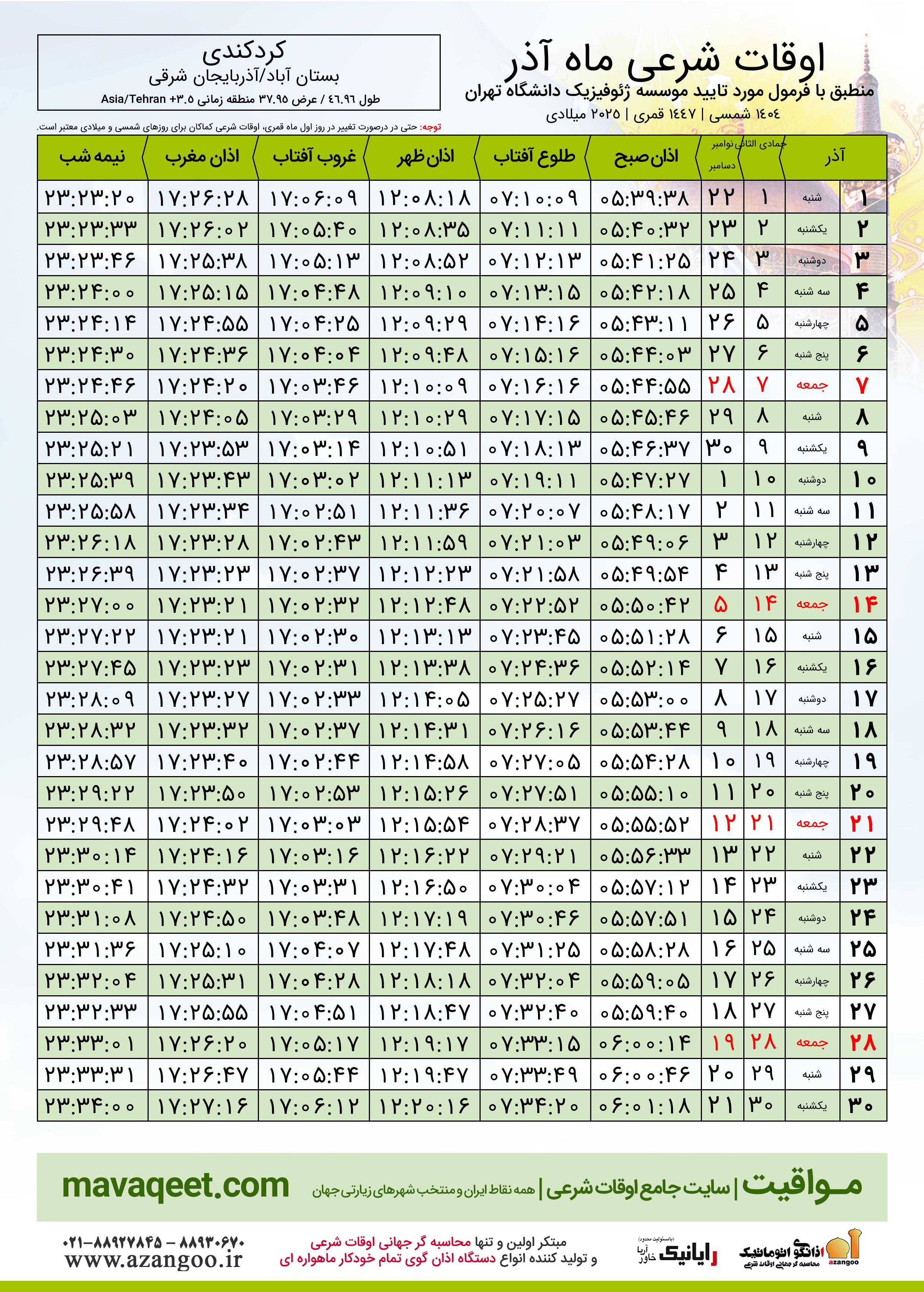 جدول اوقات شرعی آذر ١٤٠٤ شمسی شهر کردکندی