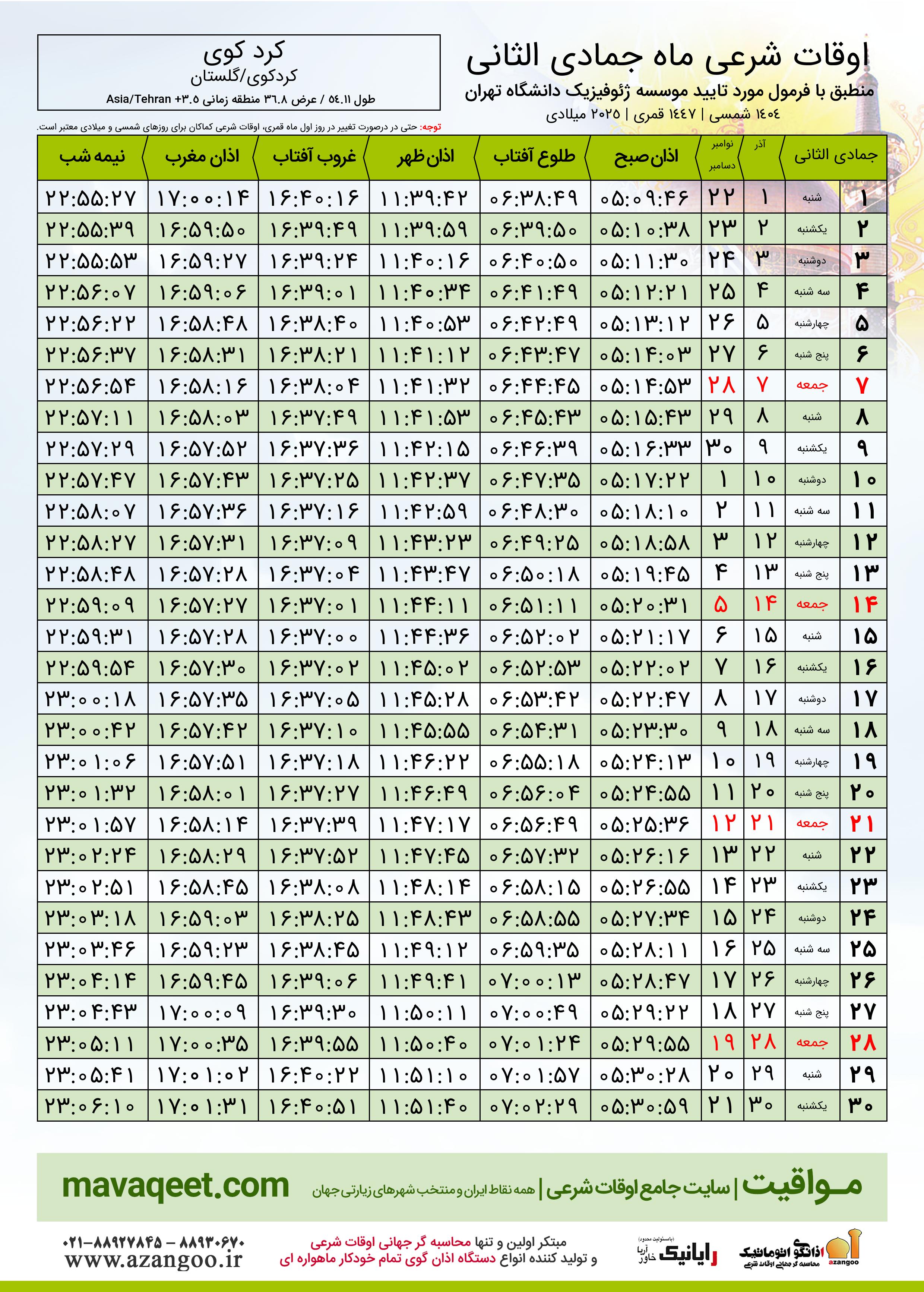 جدول اوقات شرعی جمادی الثانی ١٤٤٧ قمری شهر کرد کوی