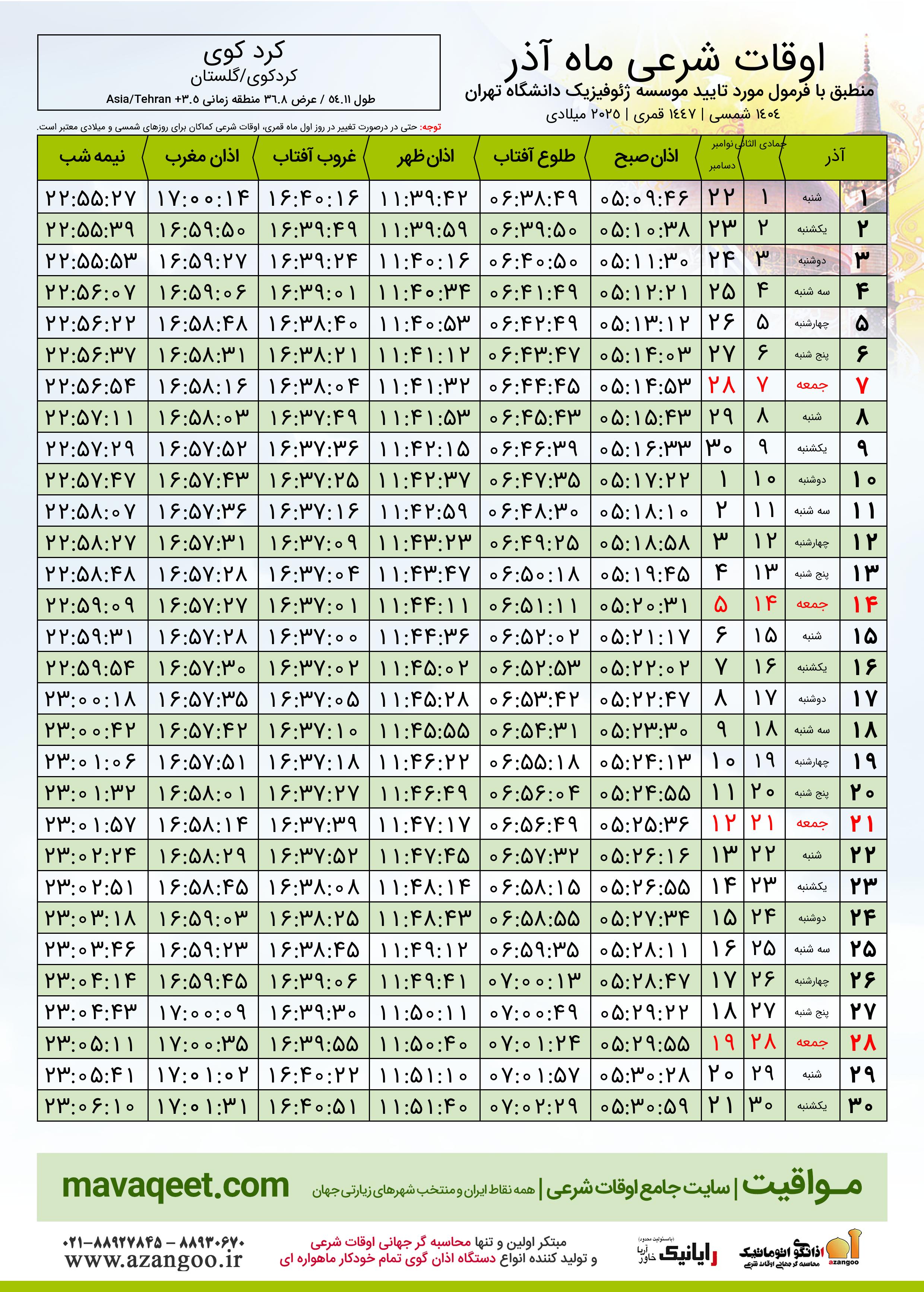 جدول اوقات شرعی آذر ١٤٠٤ شمسی شهر کرد کوی