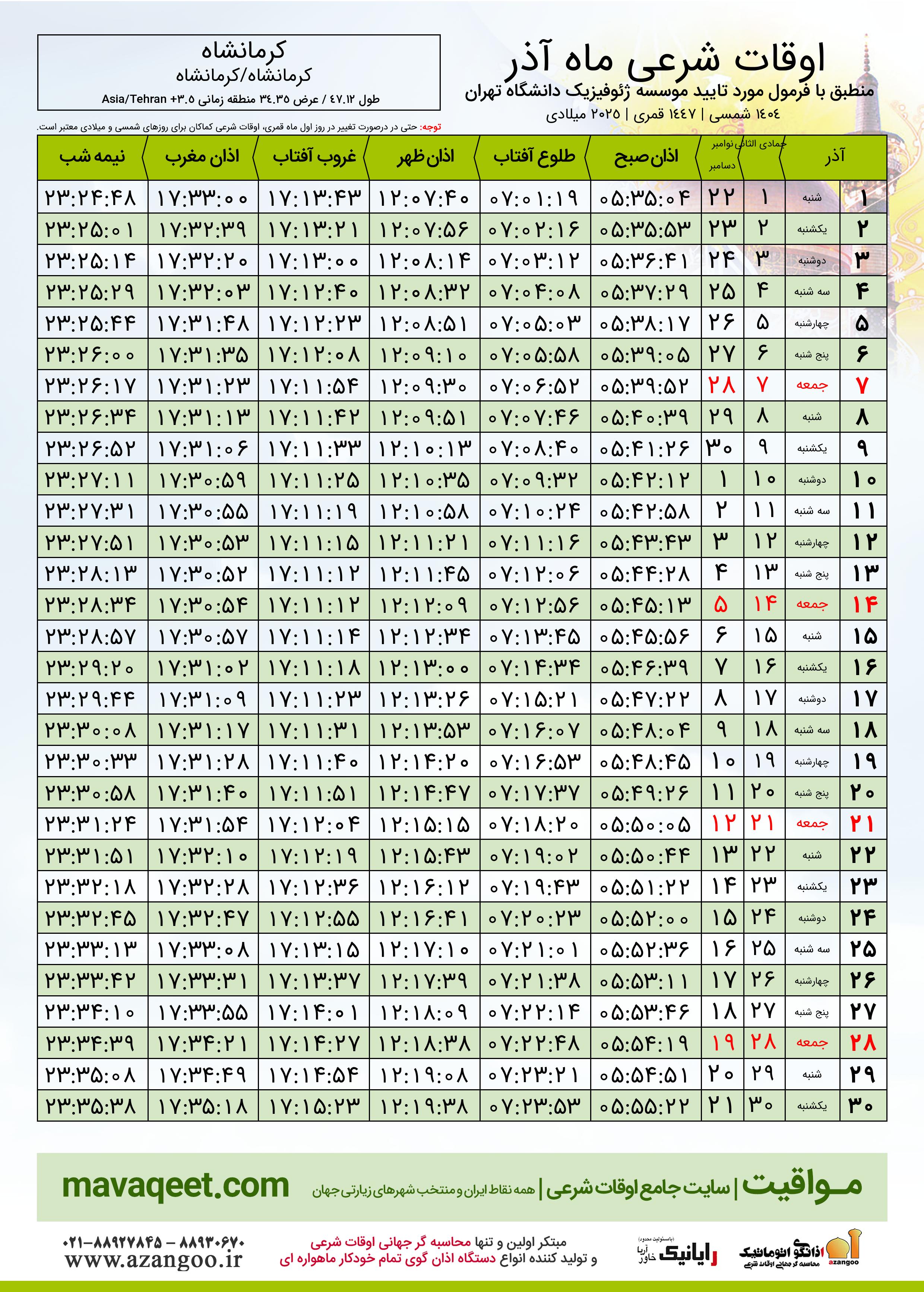 اوقات شرعی آذر ١٤٠٤ شمسی شهر کرمانشاه