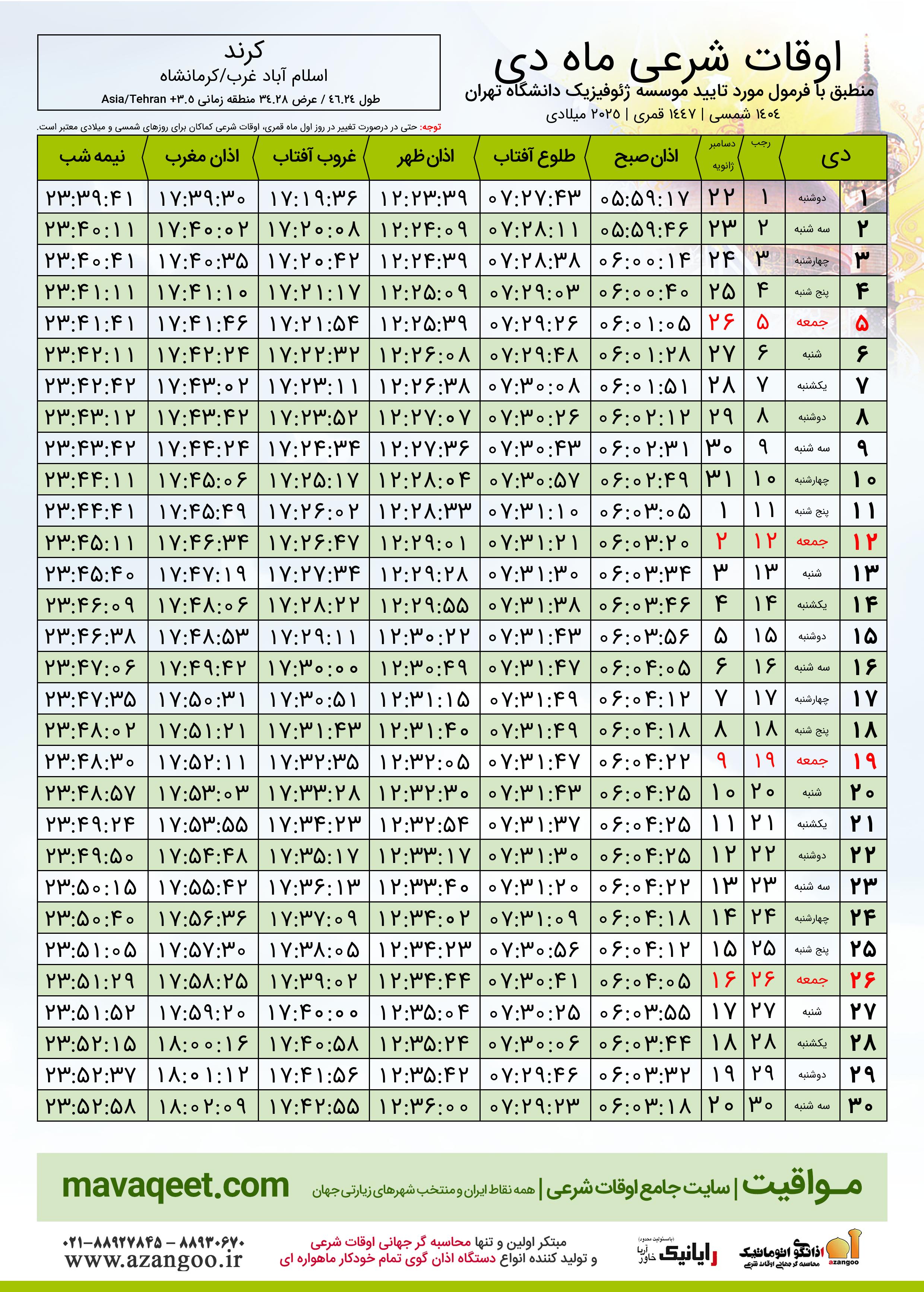 جدول اوقات شرعی دی ١٤٠٤ شمسی شهر کرند