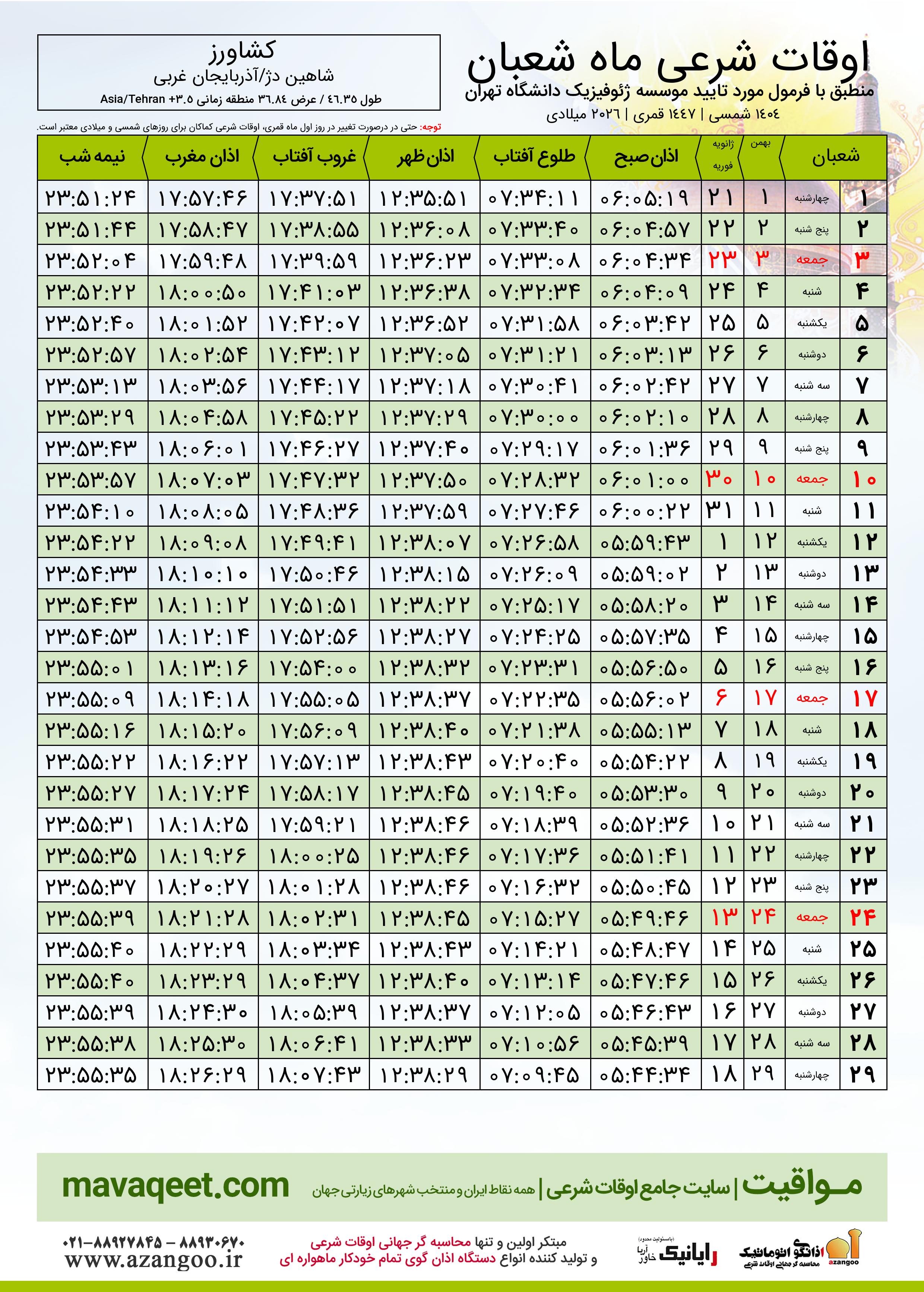 دانلود اوقات شرعی ماه شعبان ١٤٤٧ هـ.ق