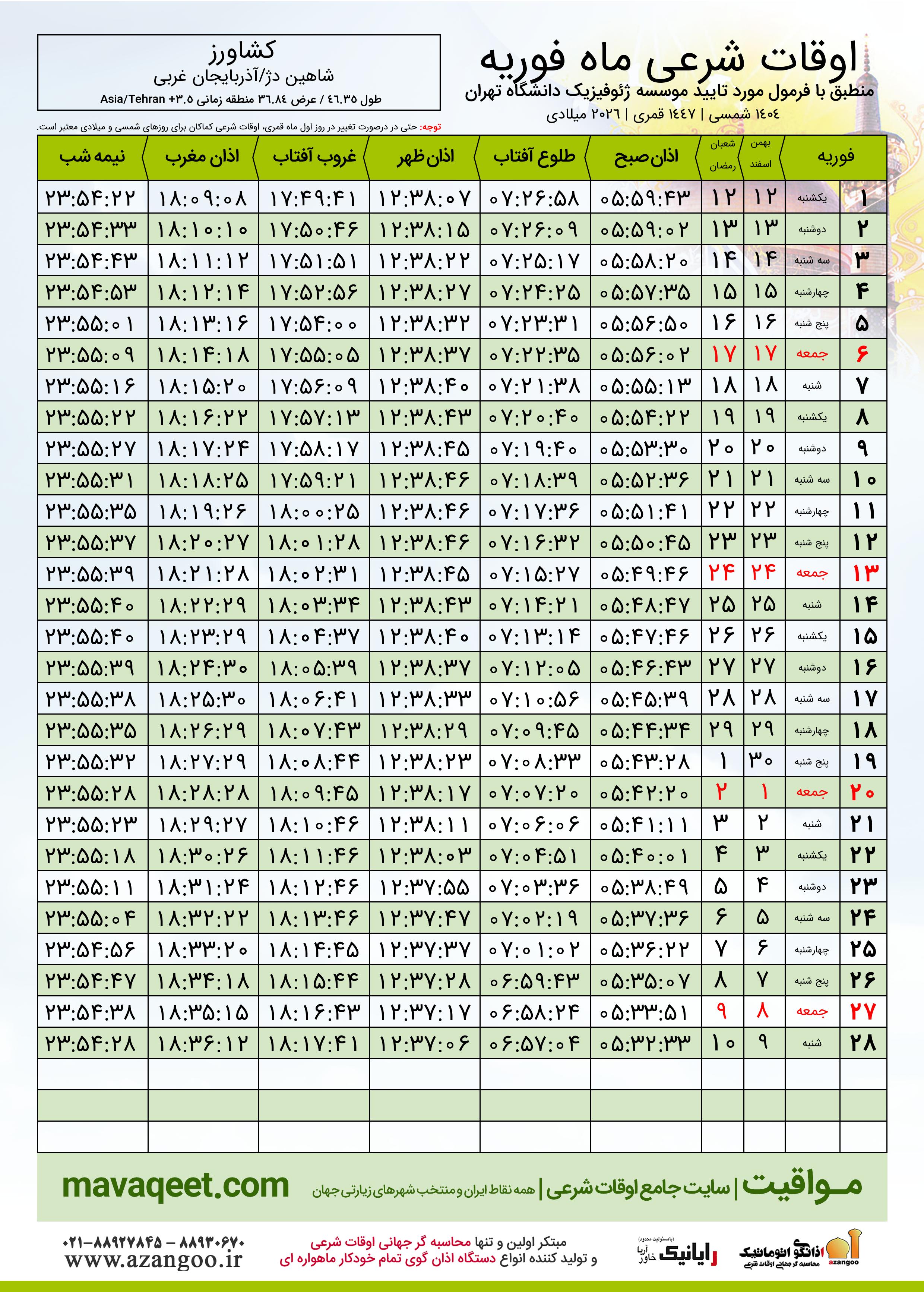 دانلود اوقات شرعی فوریه ٢٠٢٦ شهر کشاورز