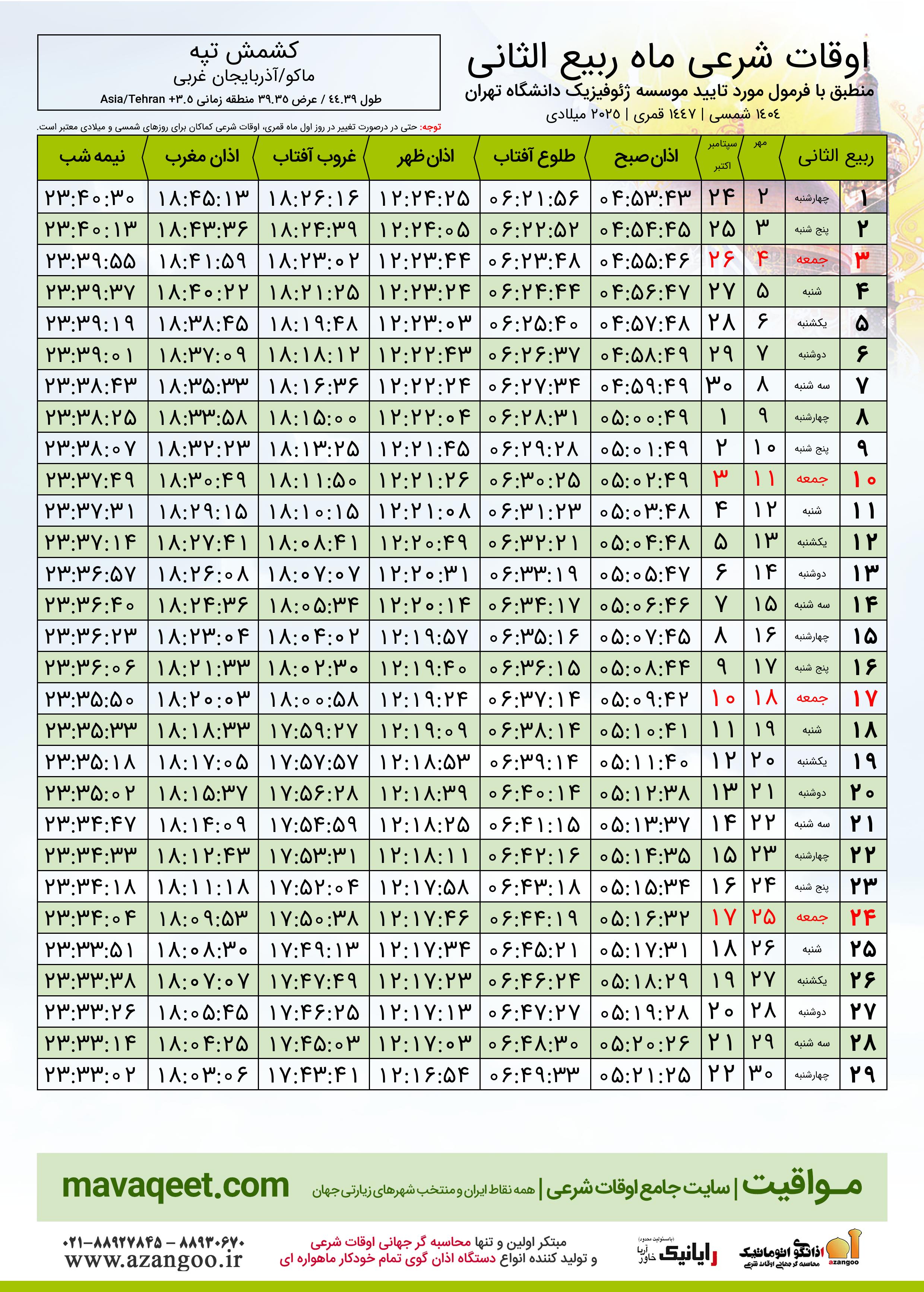 جدول اوقات شرعی ربیع الثانی ١٤٤٧ قمری شهر کشمش تپه