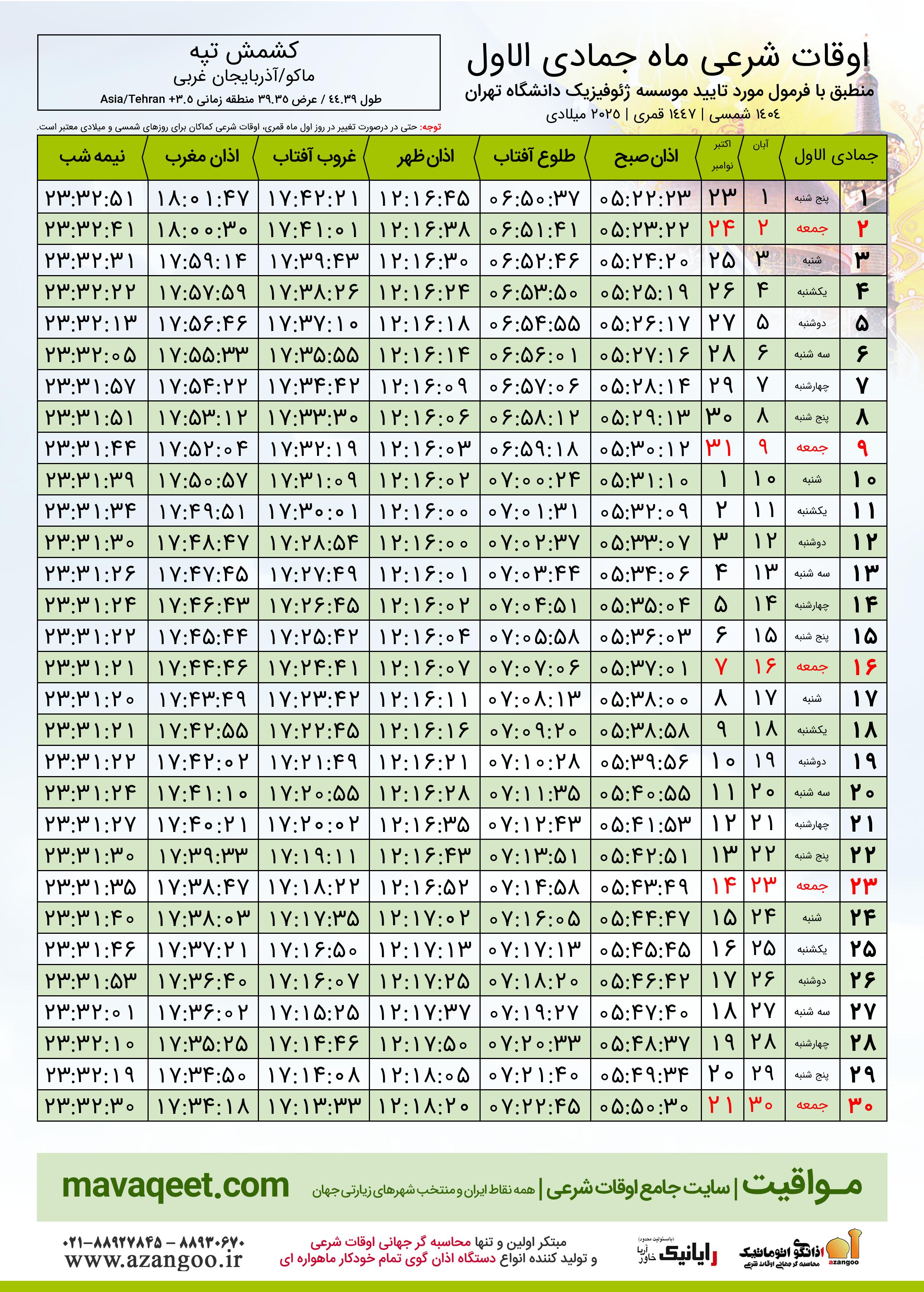 جدول اوقات شرعی جمادی الاول ١٤٤٧ قمری شهر کشمش تپه