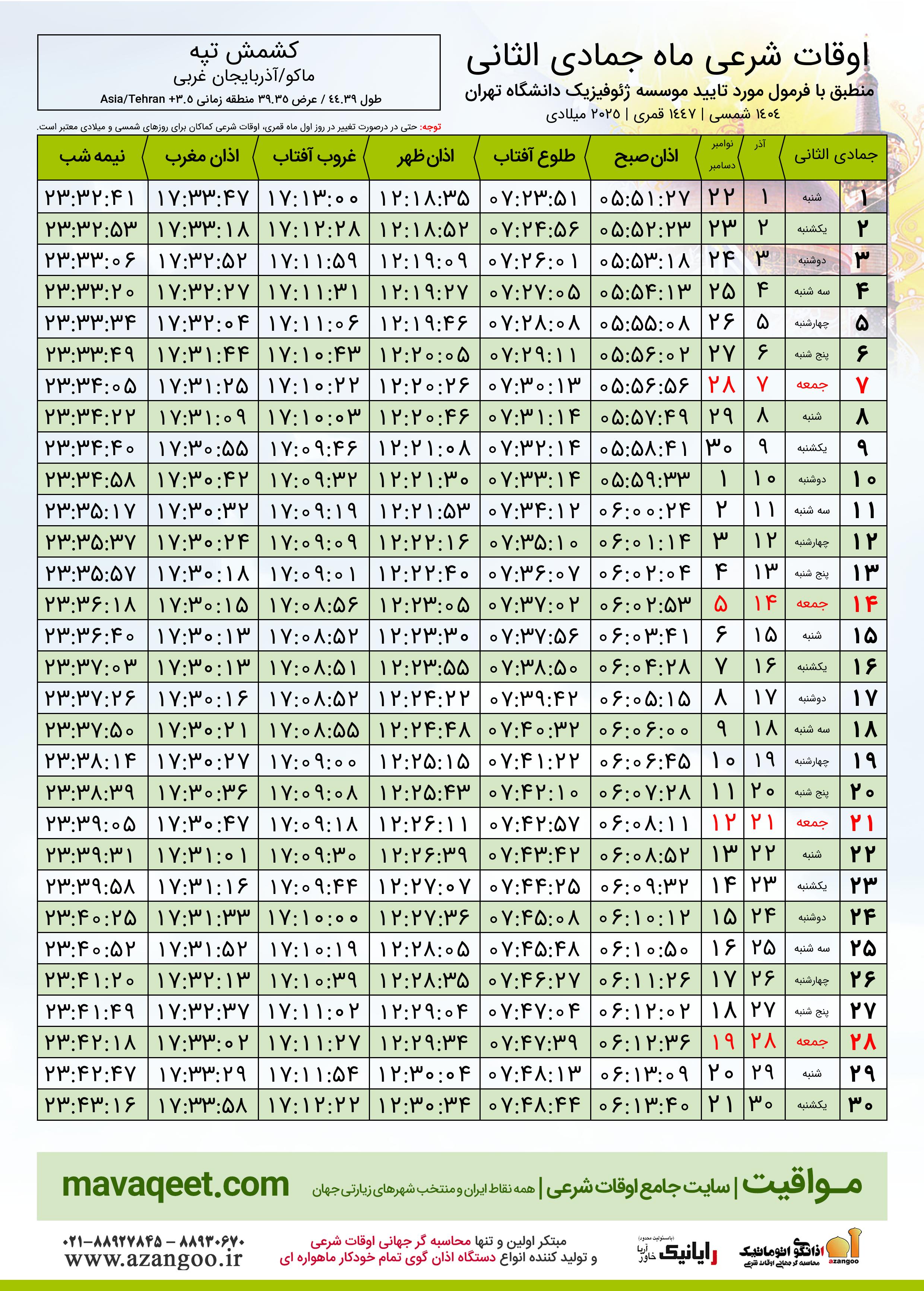 جدول اوقات شرعی جمادی الثانی ١٤٤٧ قمری شهر کشمش تپه