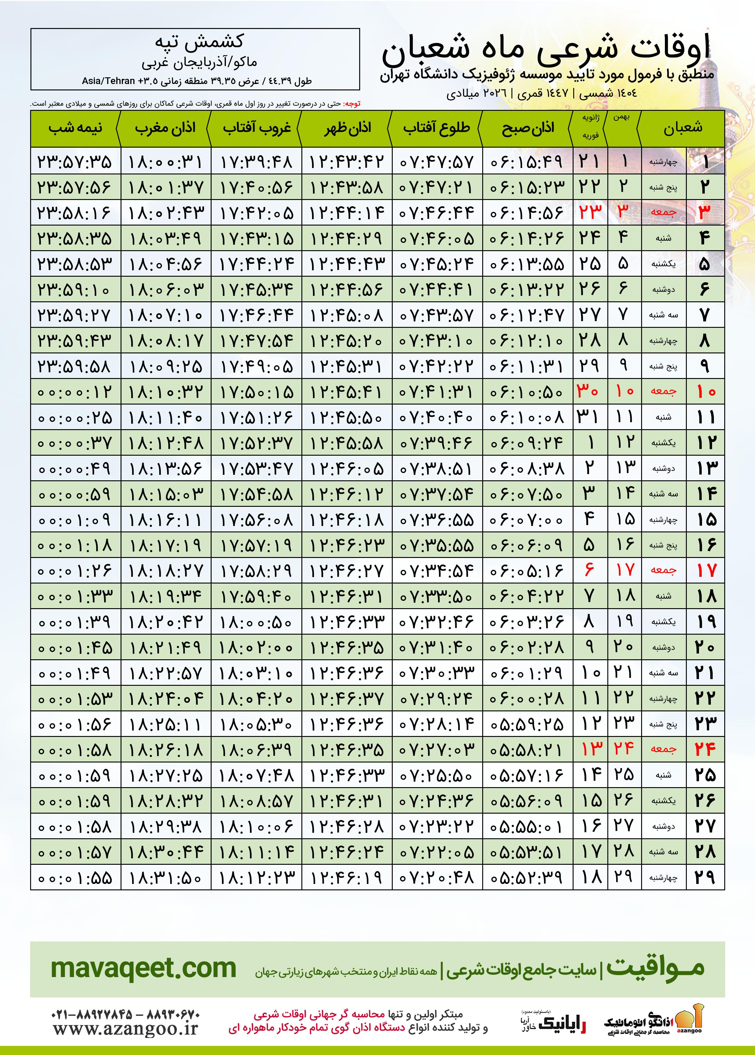 اوقات شرعی شعبان ١٤٤٧ قمری شهر کشمش تپه