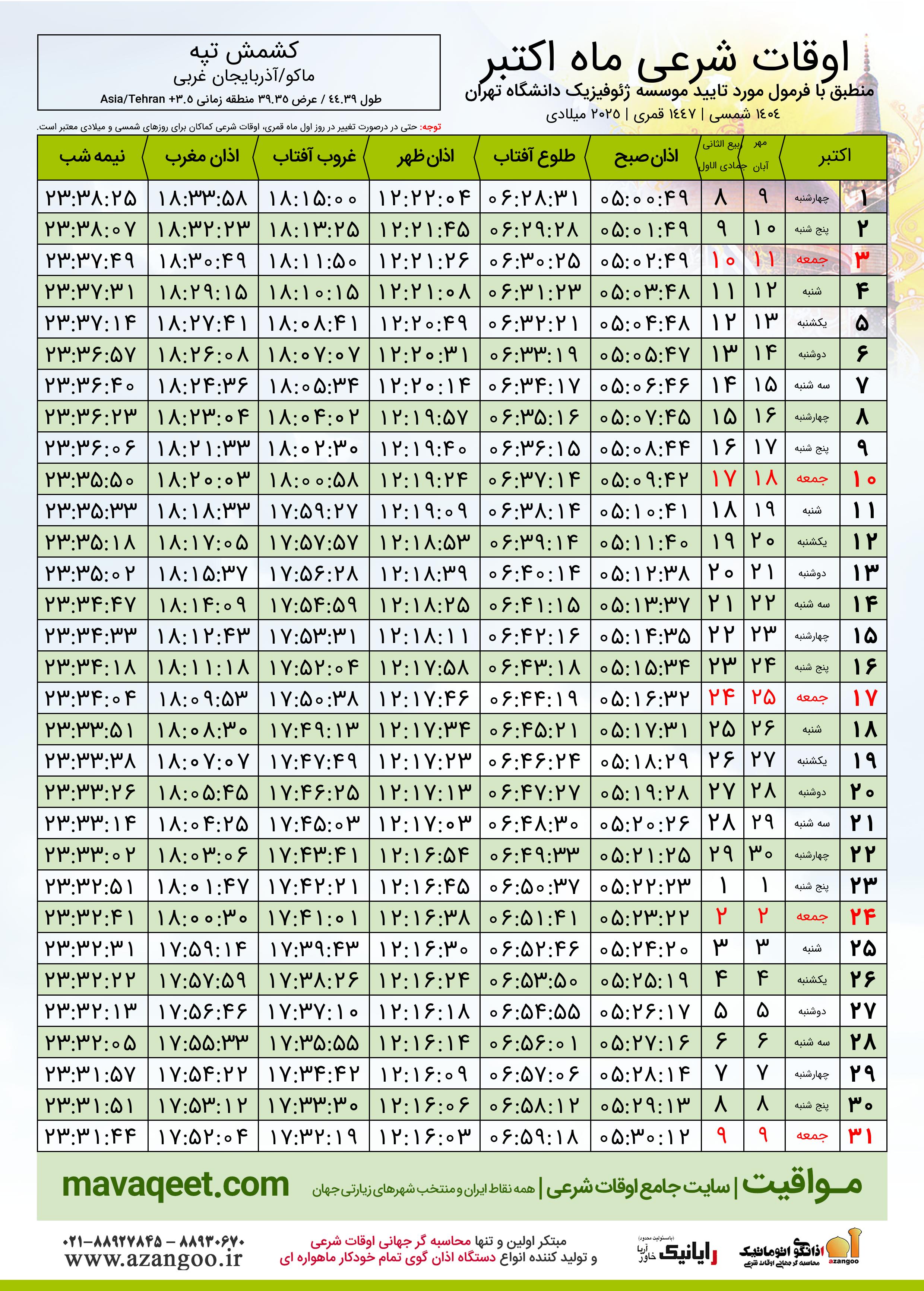 جهت نمایش تصویر جدول اوقات شرعی جدول اوقات شرعی اکتبر ٢٠٢٥ میلادی شهر کشمش تپه شهر کشمش تپه در اندازه