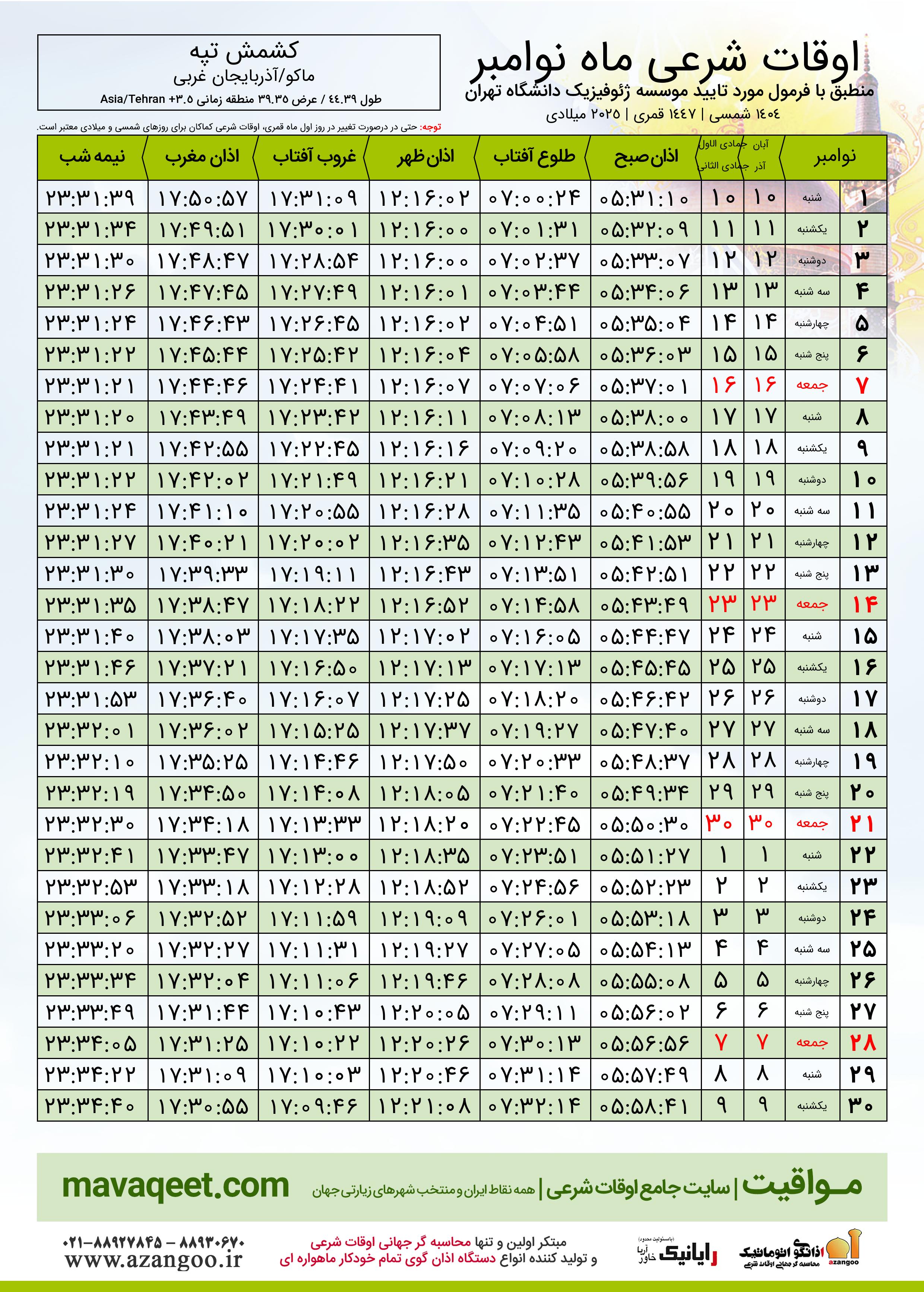 جدول اوقات شرعی نوامبر ٢٠٢٥ میلادی شهر کشمش تپه