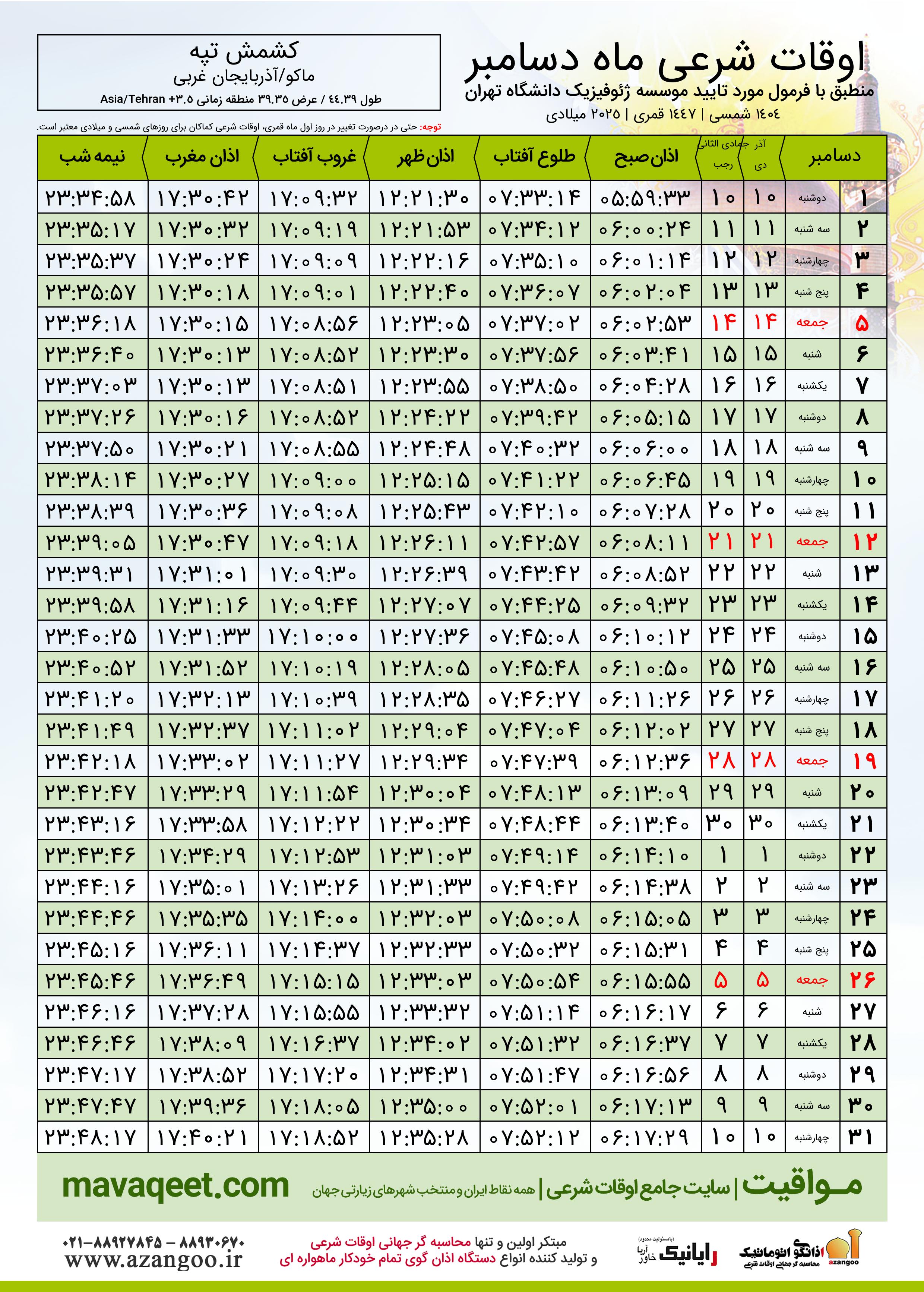 جدول اوقات شرعی آذر ١٤٠٤ شمسی شهر کشمش تپه