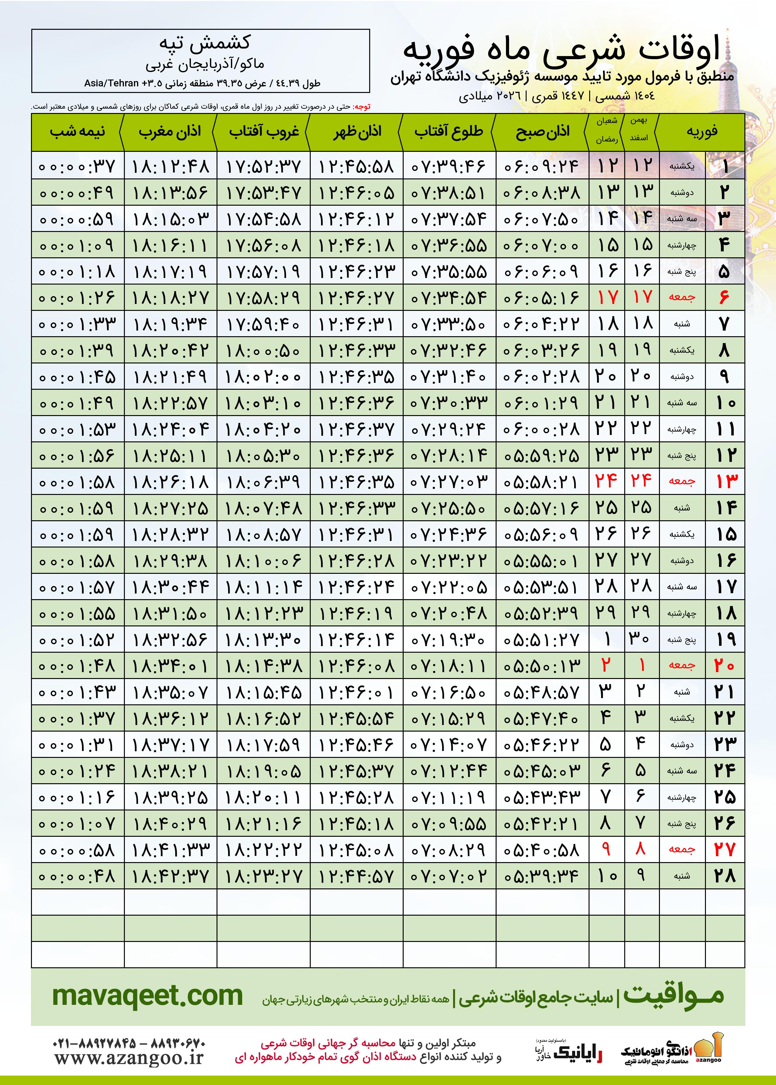 دانلود اوقات شرعی فوریه ٢٠٢٦ شهر کشمش تپه