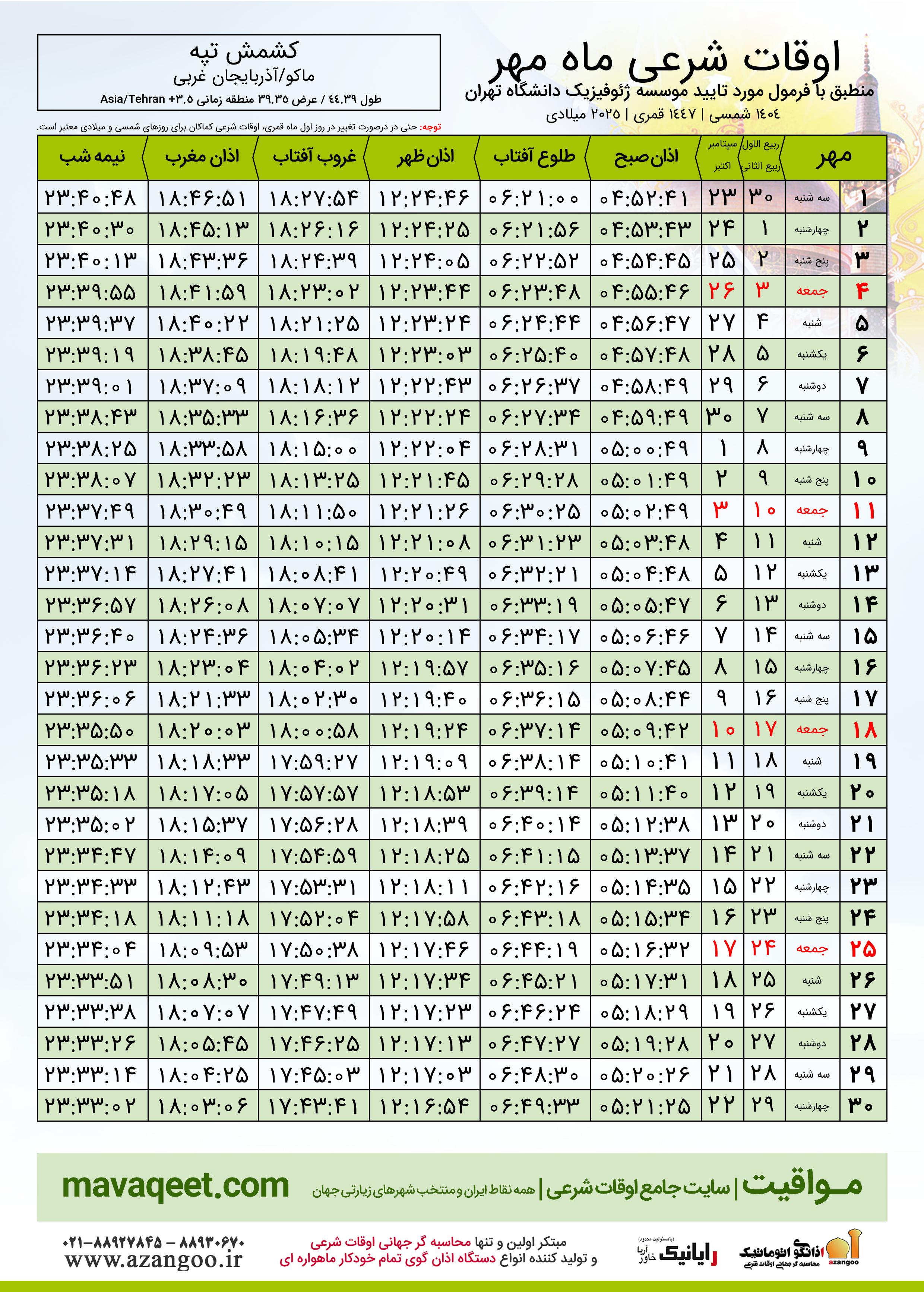 اوقات شرعی مهر ١٤٠٤ شمسی شهر کشمش تپه
