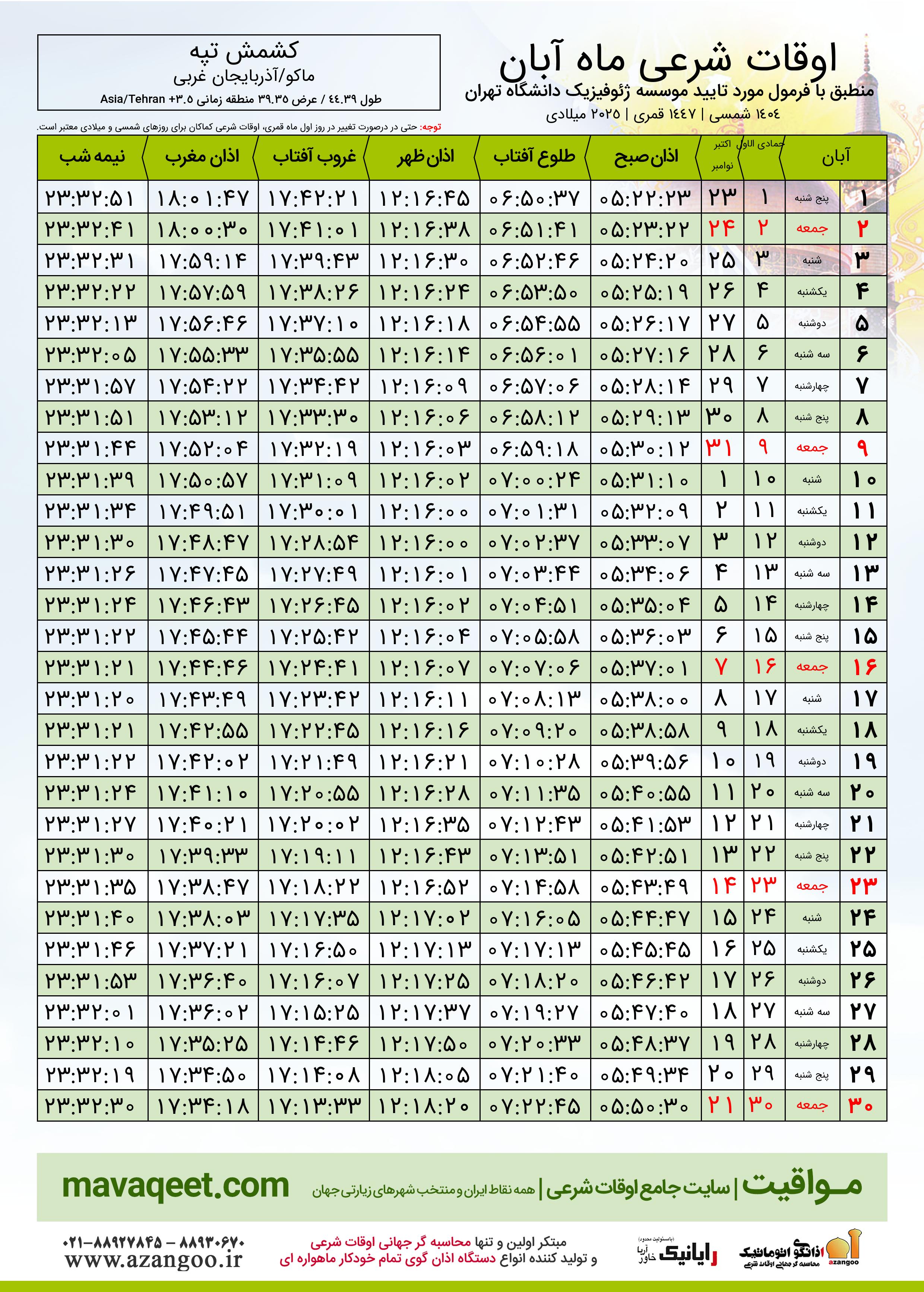 جدول اوقات شرعی آبان ١٤٠٤ شمسی شهر کشمش تپه