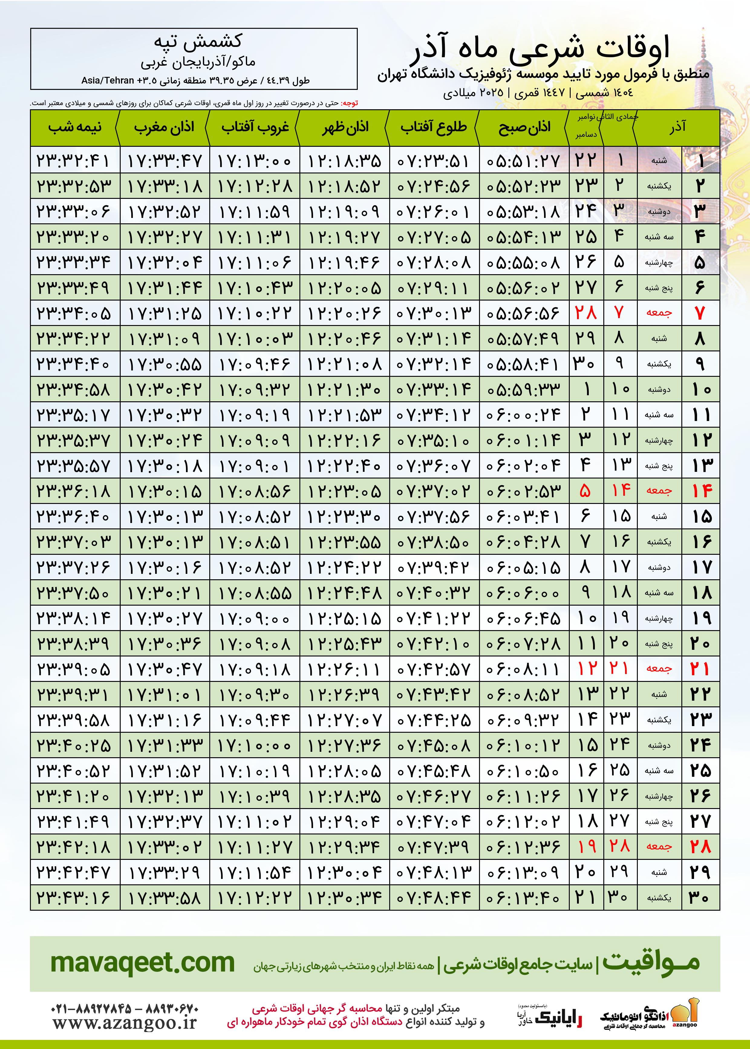 اوقات شرعی آذر ١٤٠٤ شمسی شهر کشمش تپه