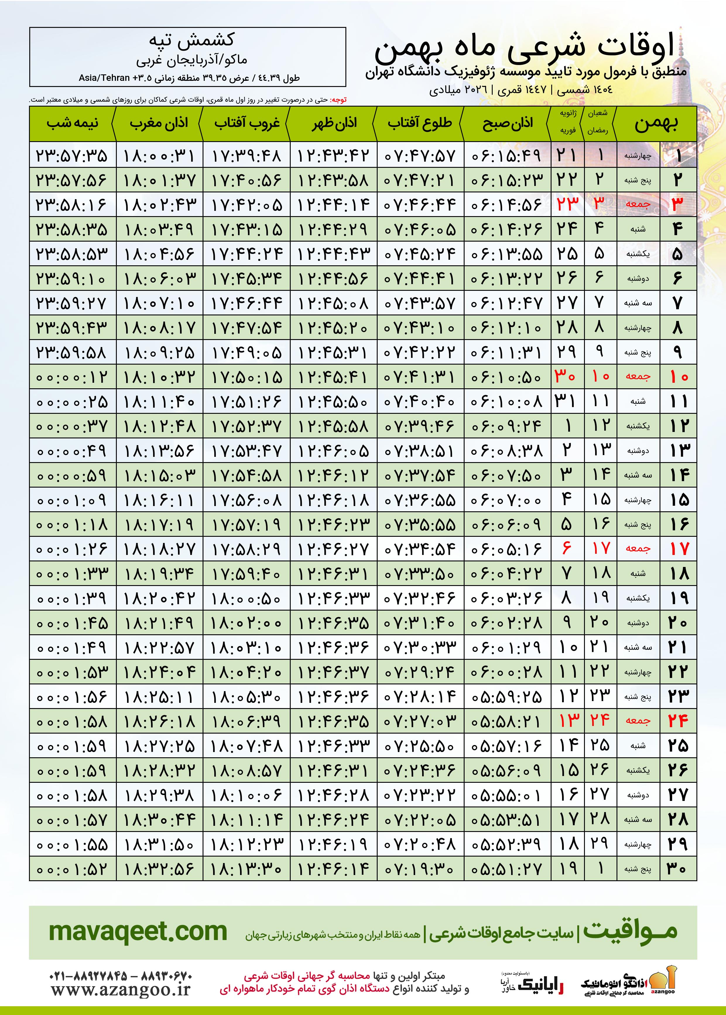 دانلود اوقات شرعی بهمن ٠٤ - ١٤٠٤ شهر کشمش تپه