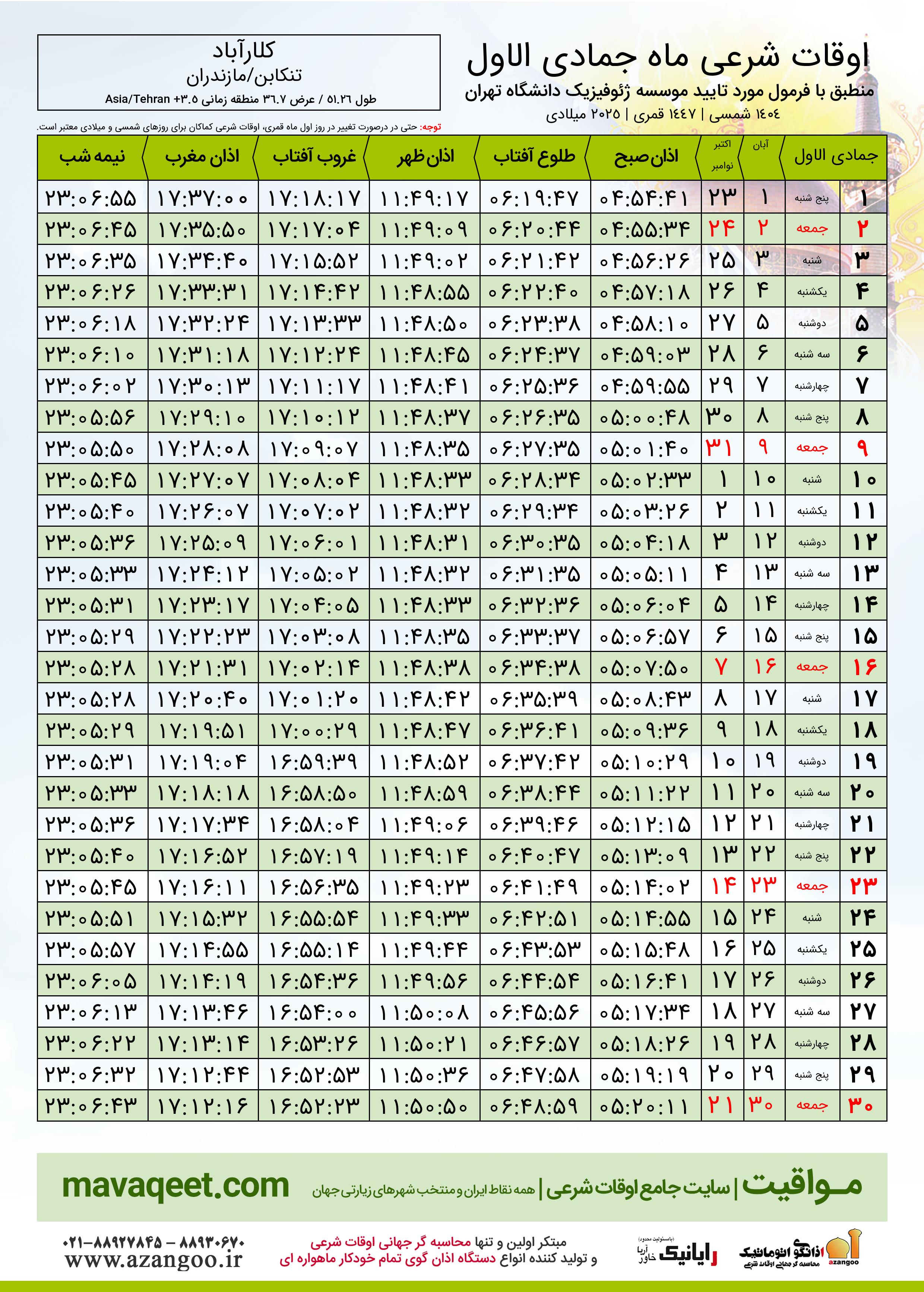 جدول اوقات شرعی جمادی الاول ١٤٤٧ قمری شهر کلارآباد