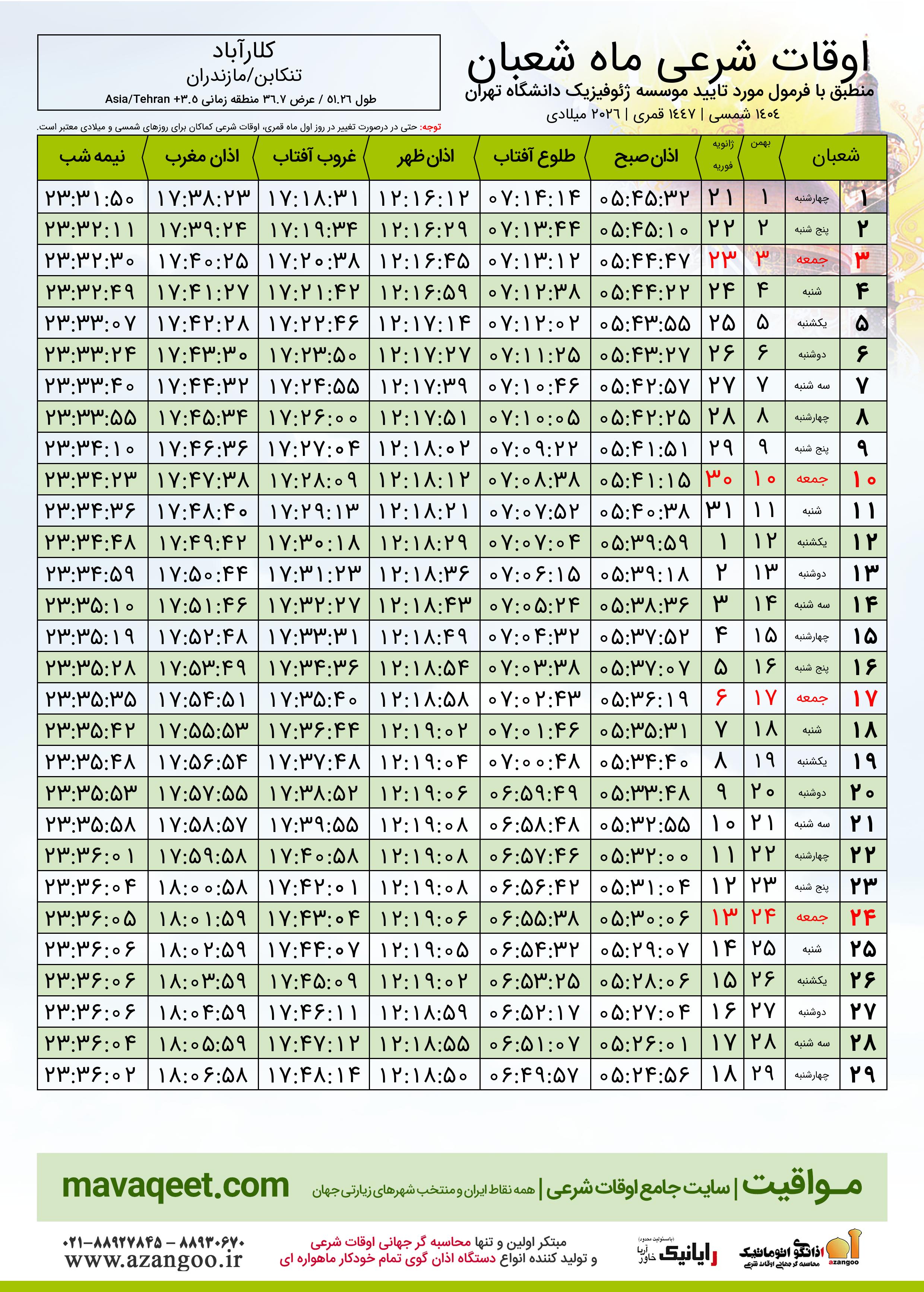 اوقات شرعی ماه شعبان ١٤٤٧ هـ.ق شهر کلارآباد بر