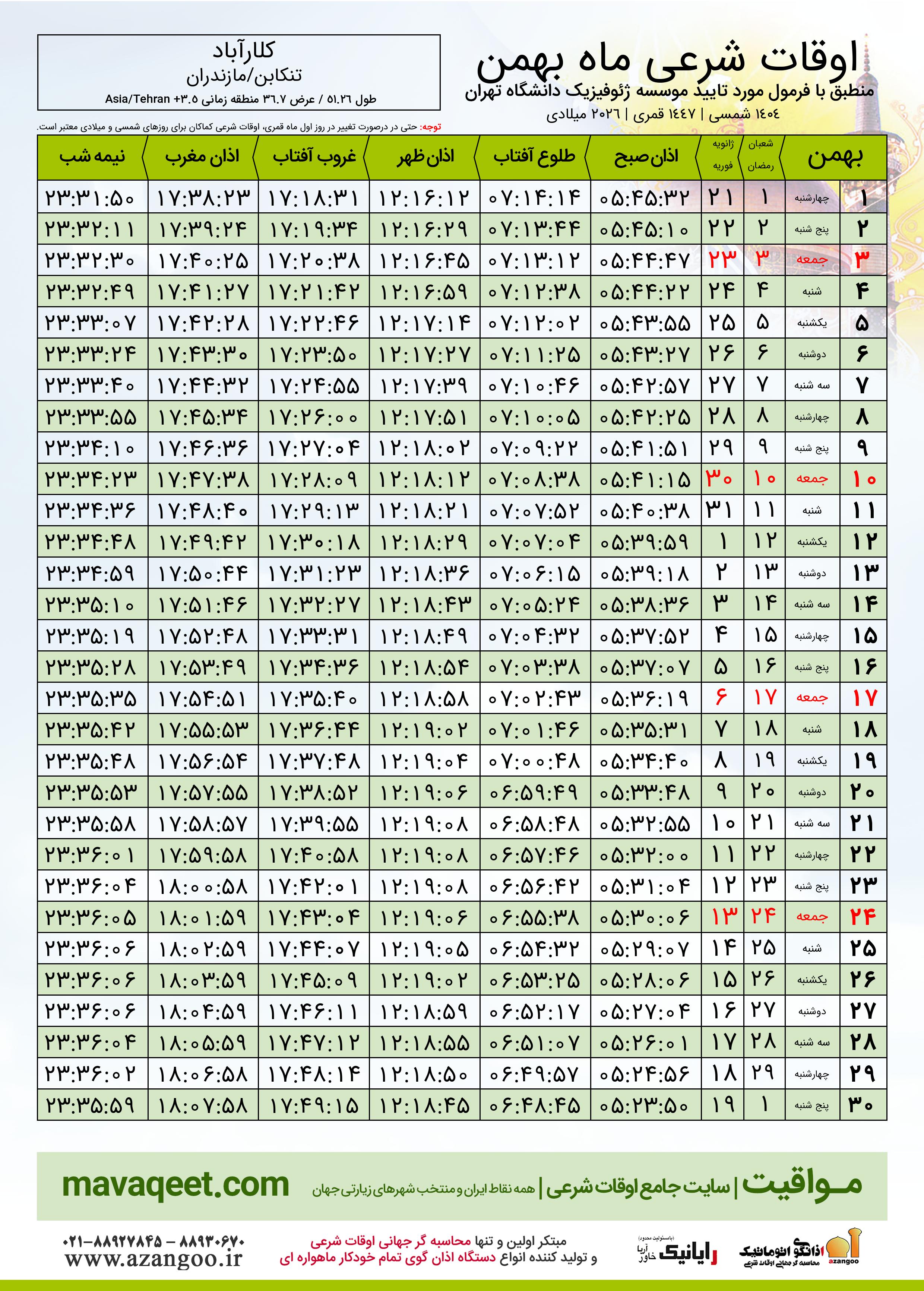 دانلود اوقات شرعی بهمن ٠٤ - ١٤٠٤ شهر کلارآباد