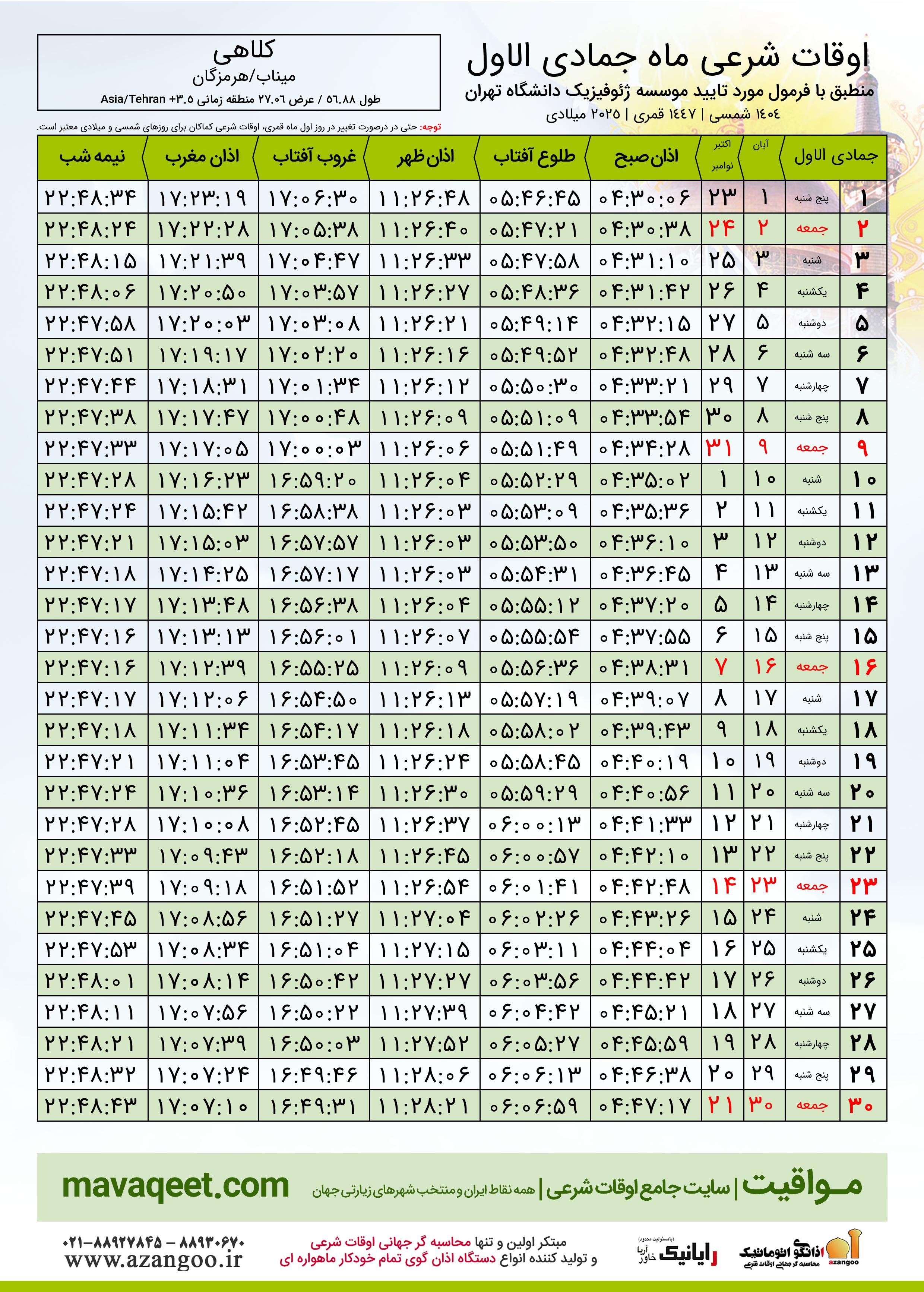 اوقات شرعی ماه جمادی الاول ١٤٤٧ هـ.ق شهر کلاهی بر