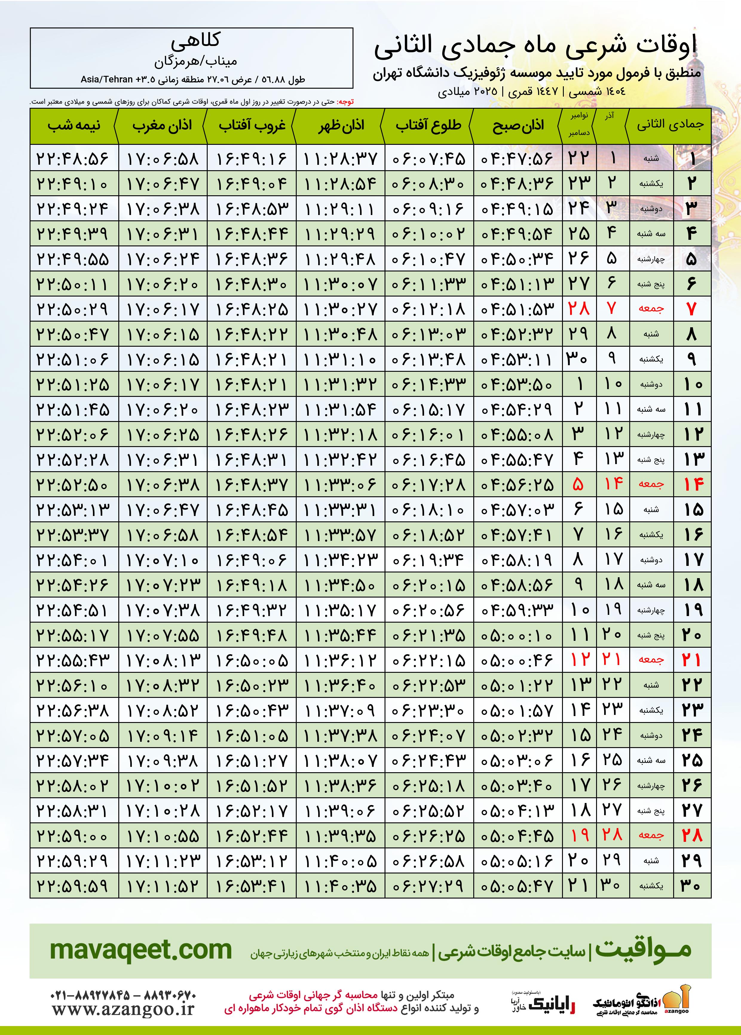 اوقات شرعی ماه جمادی الثانی ١٤٤٧ هـ.ق شهر کلاهی بر