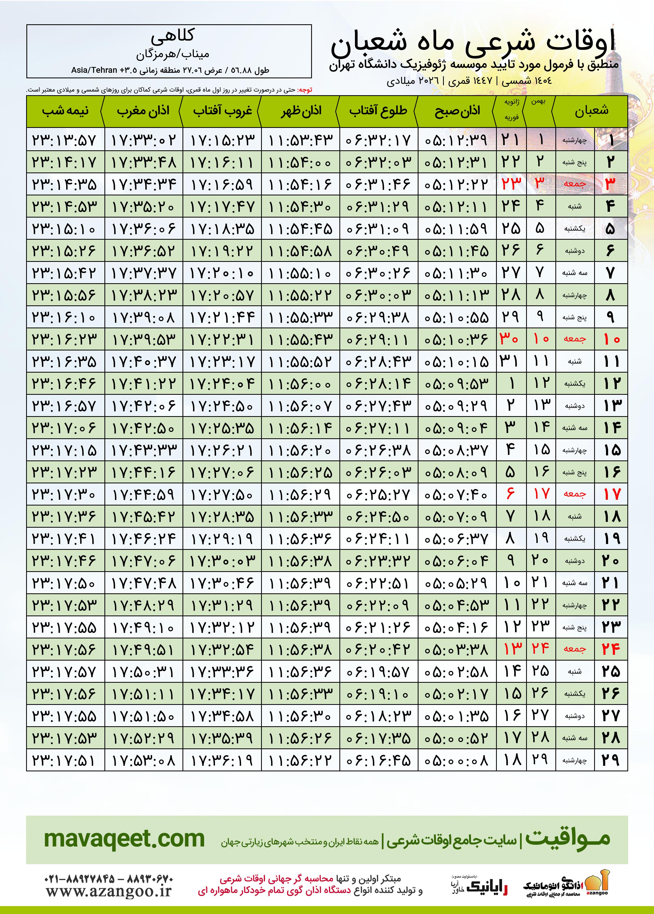 اوقات شرعی ماه شعبان ١٤٤٧ هـ.ق شهر کلاهی بر