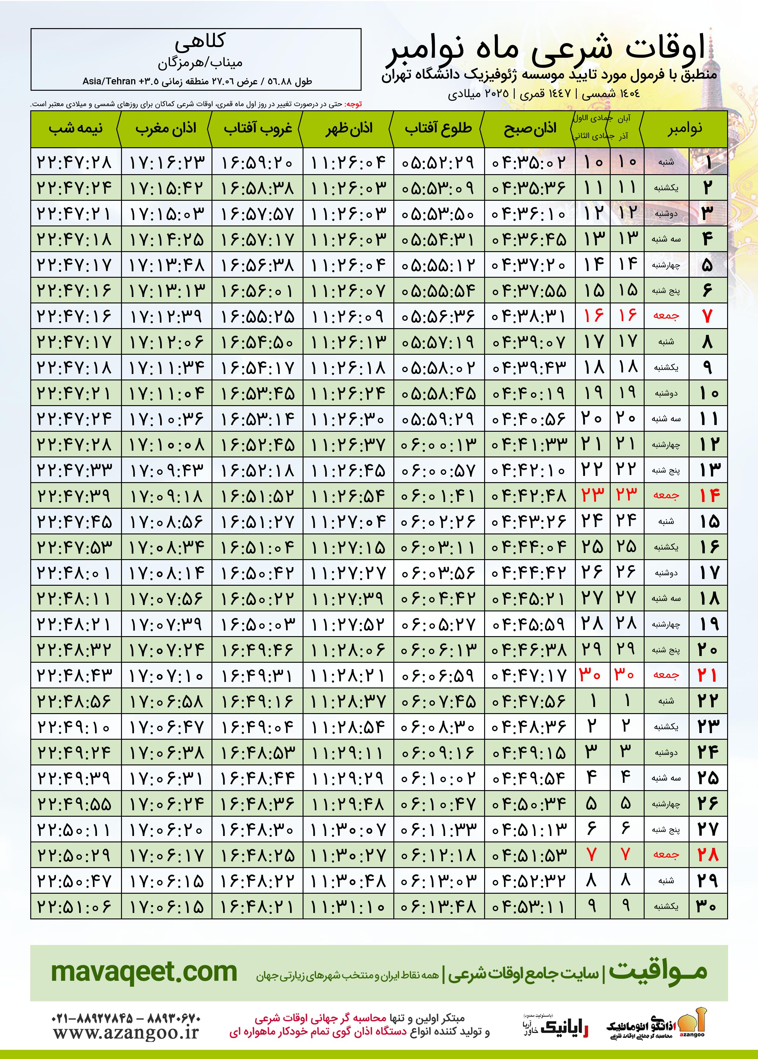 جهت نمایش تصویر جدول اوقات شرعی جدول اوقات شرعی نوامبر ٢٠٢٥ میلادی شهر کلاهی شهر کلاهی در اندازه