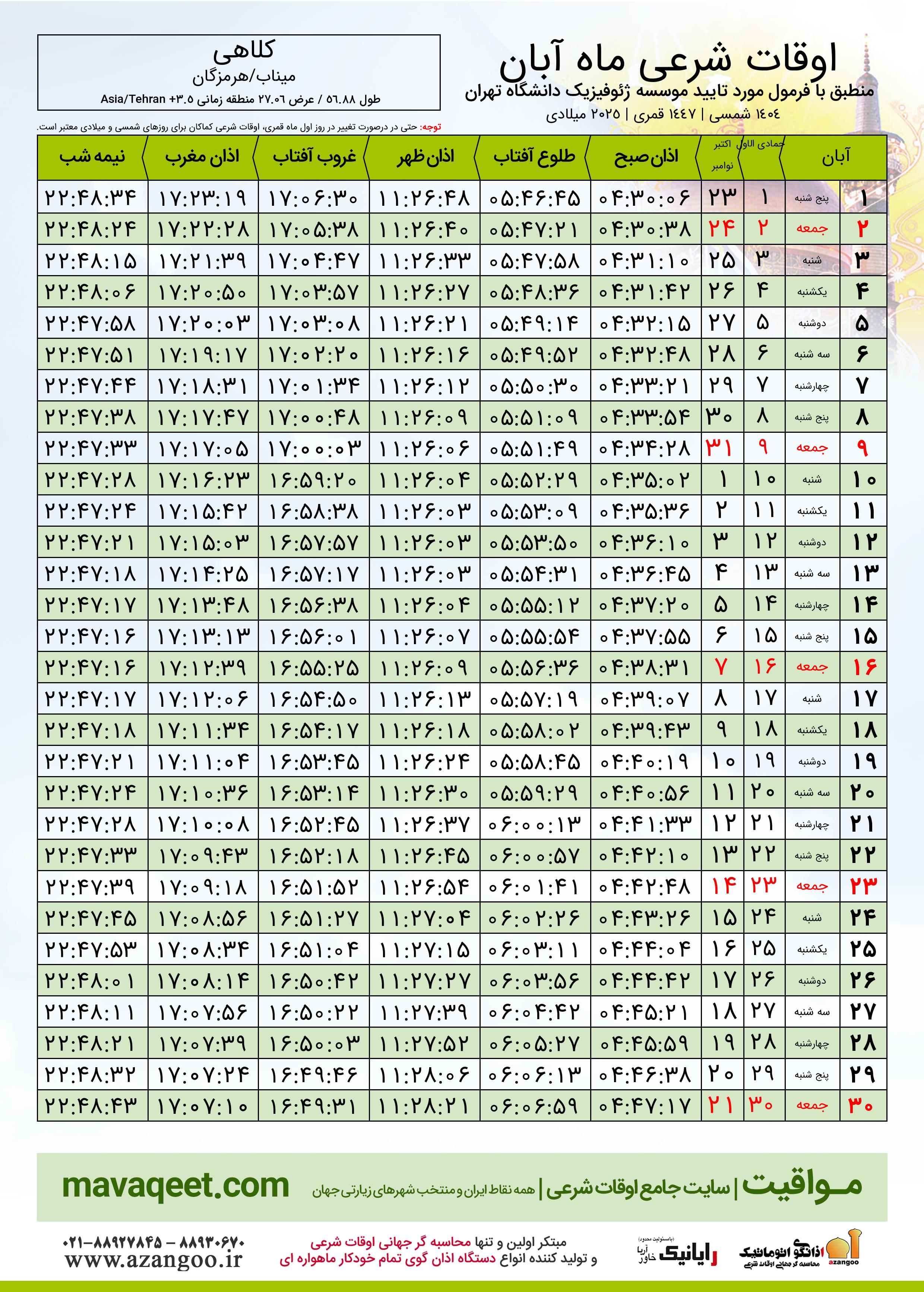 اوقات شرعی آبان ١٤٠٤ شمسی شهر کلاهی