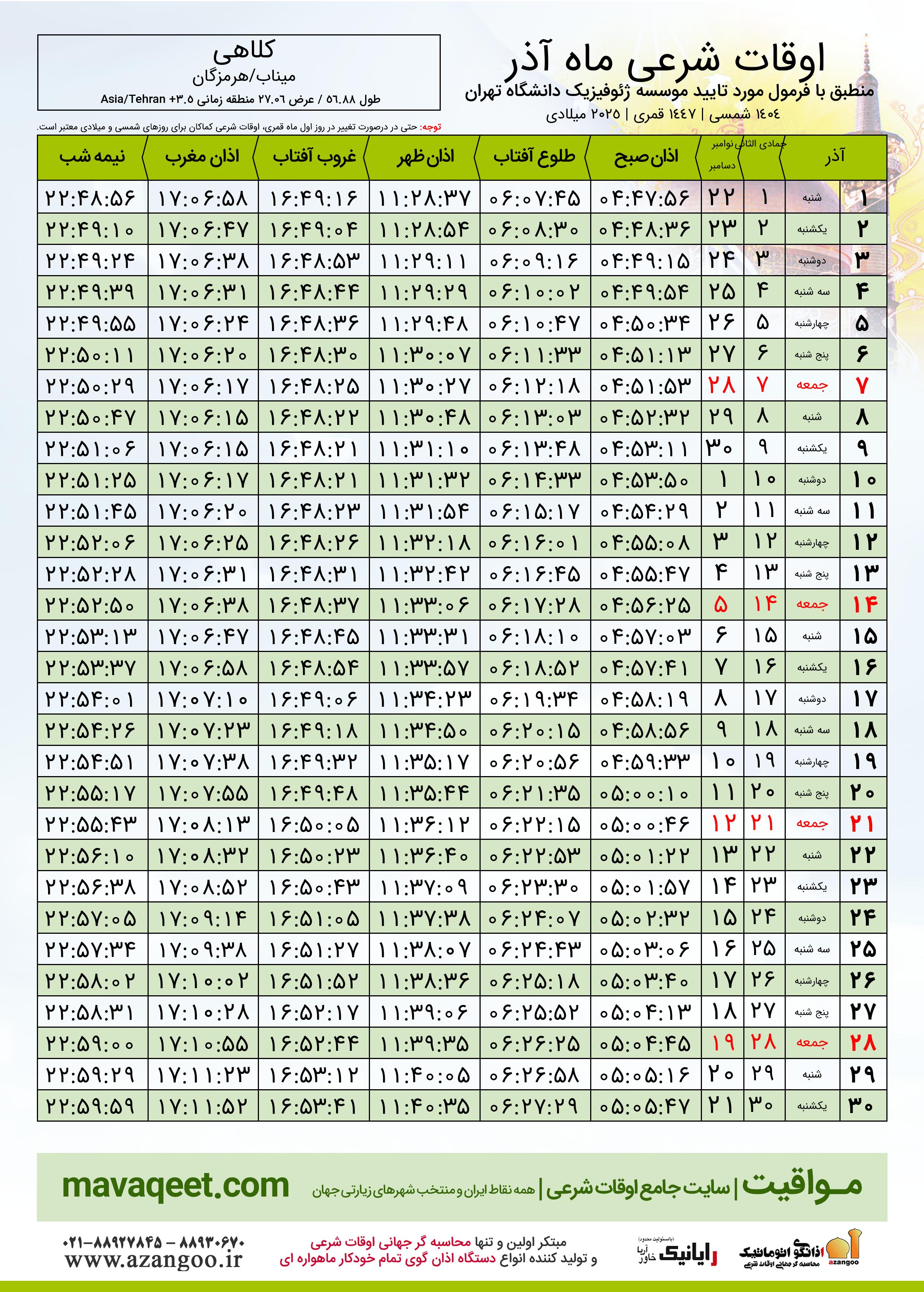 اوقات شرعی آذر ١٤٠٤ شمسی شهر کلاهی