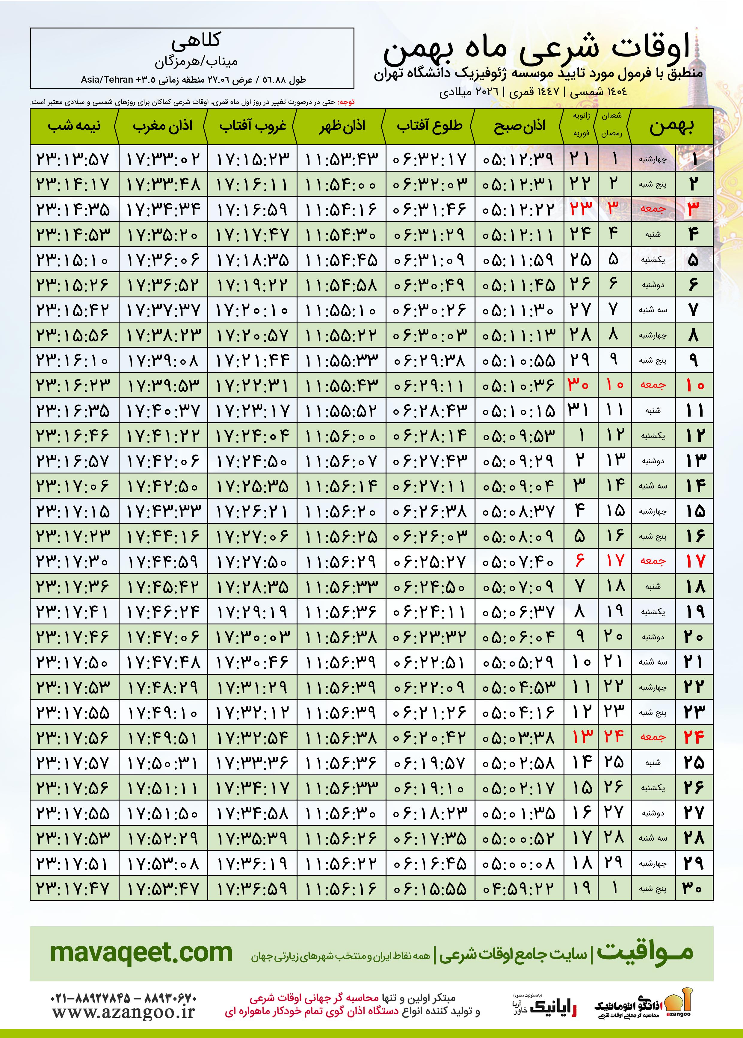 دانلود اوقات شرعی بهمن ٠٤ - ١٤٠٤ شهر کلاهی