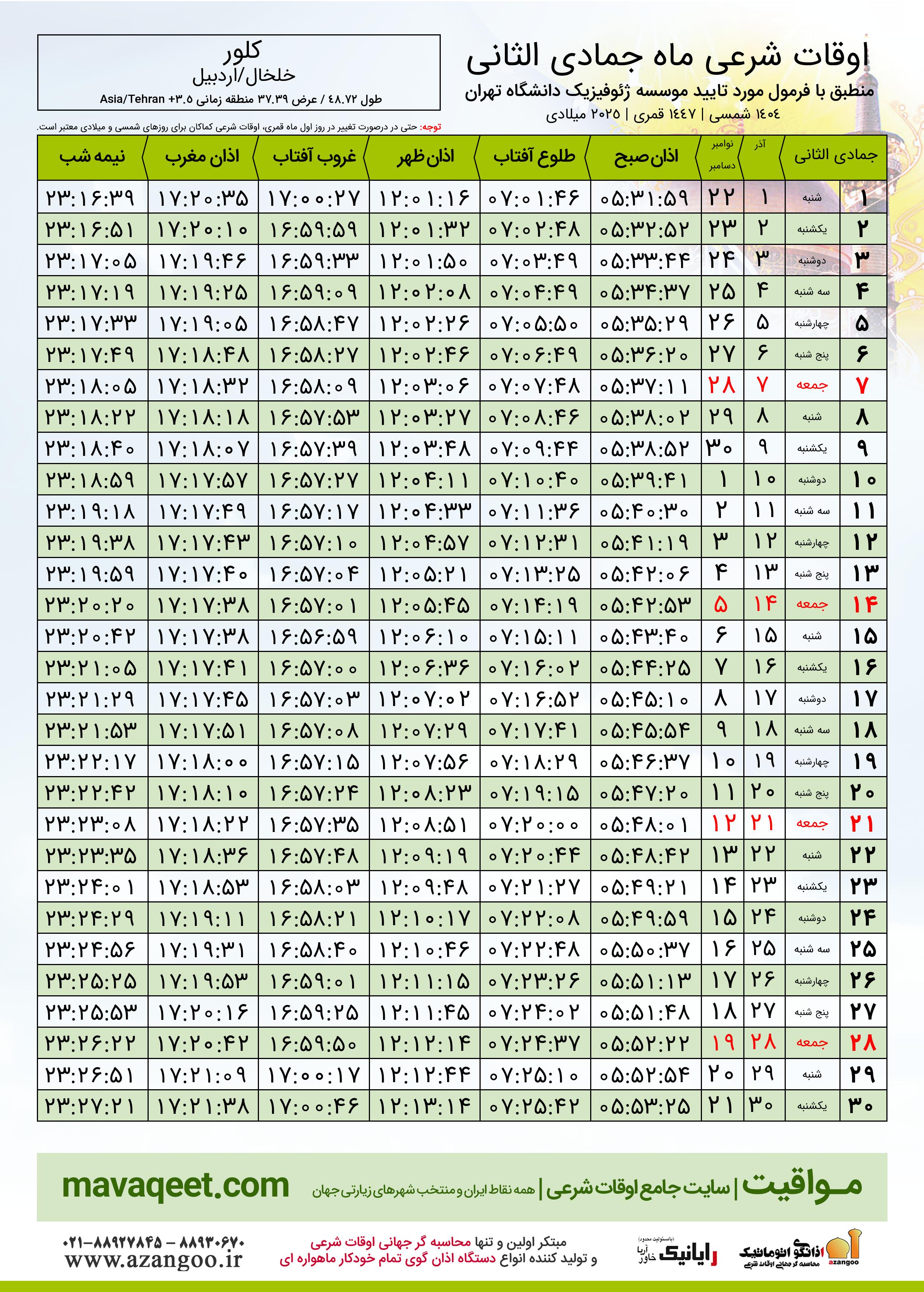 اوقات شرعی ماه جمادی الثانی ١٤٤٧ هـ.ق شهر کلور بر