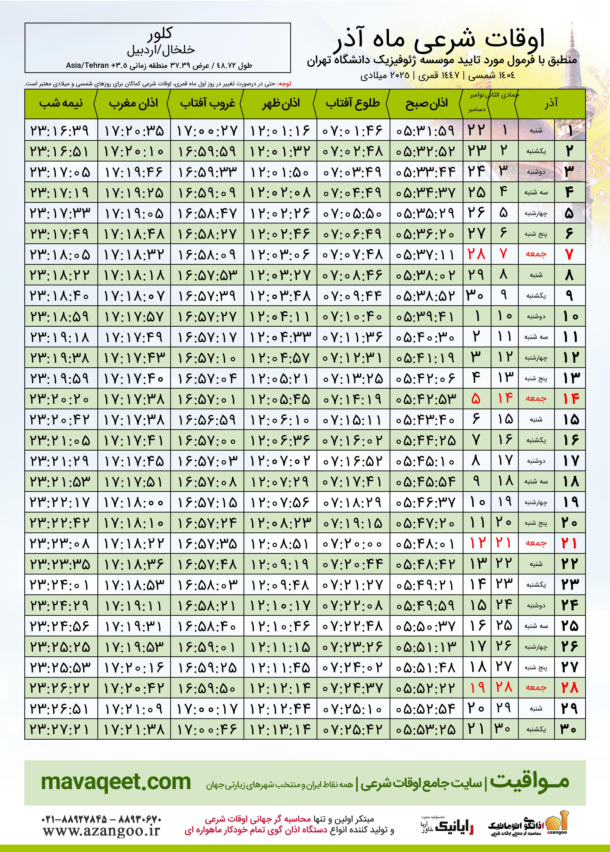 اوقات شرعی آذر ١٤٠٤ شمسی شهر کلور