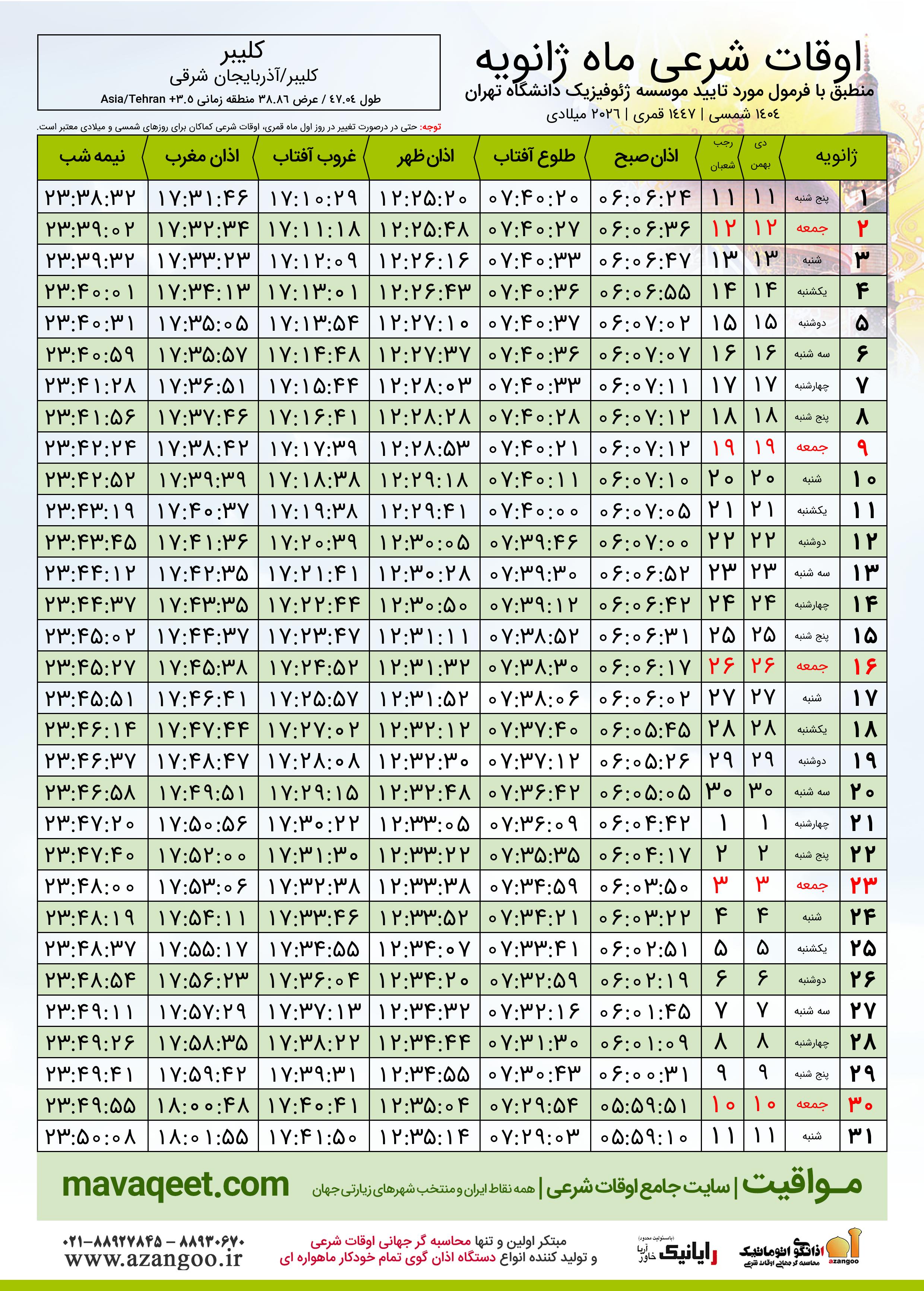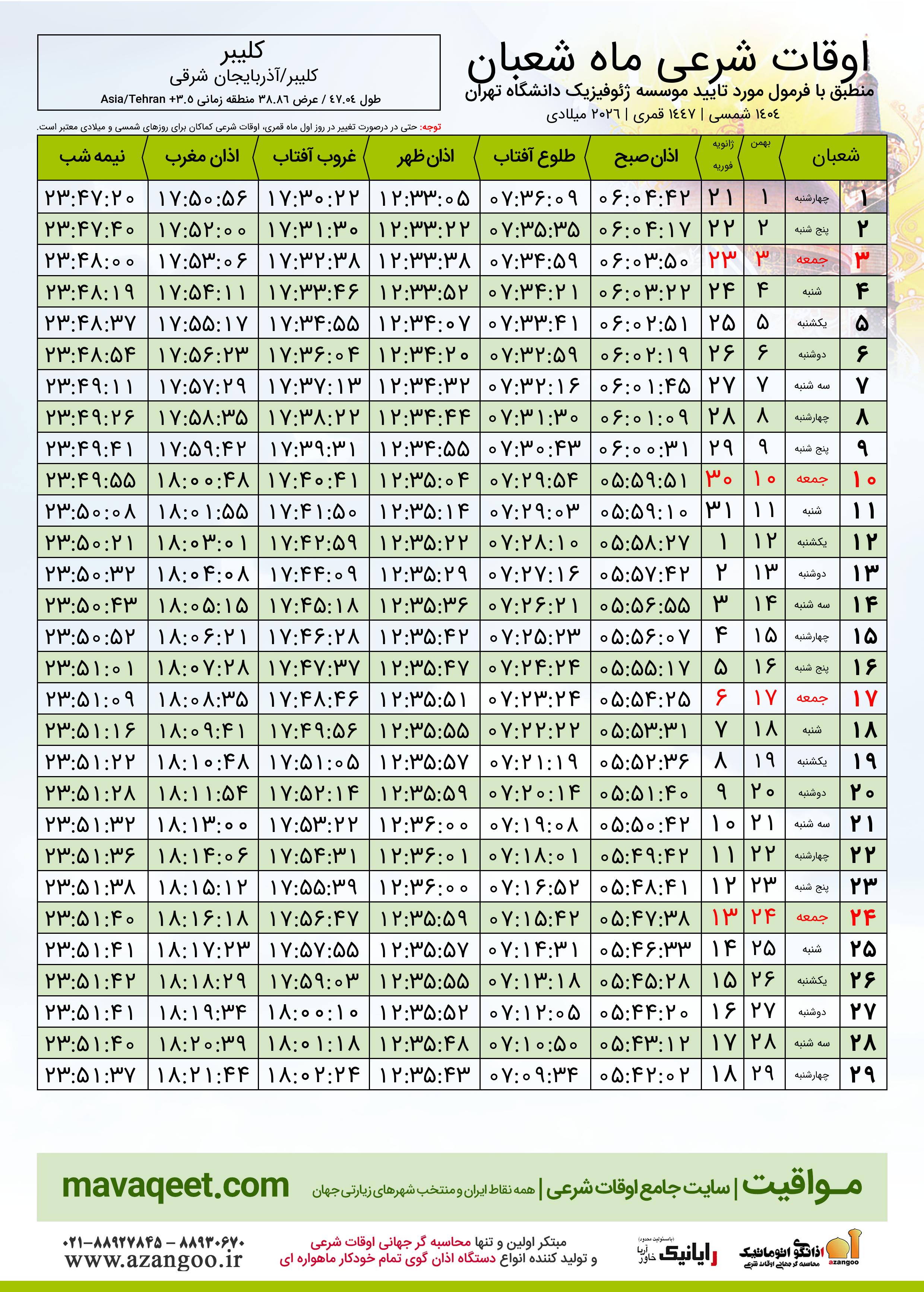 اوقات شرعی ماه شعبان ١٤٤٧ هـ.ق شهر کلیبر بر
