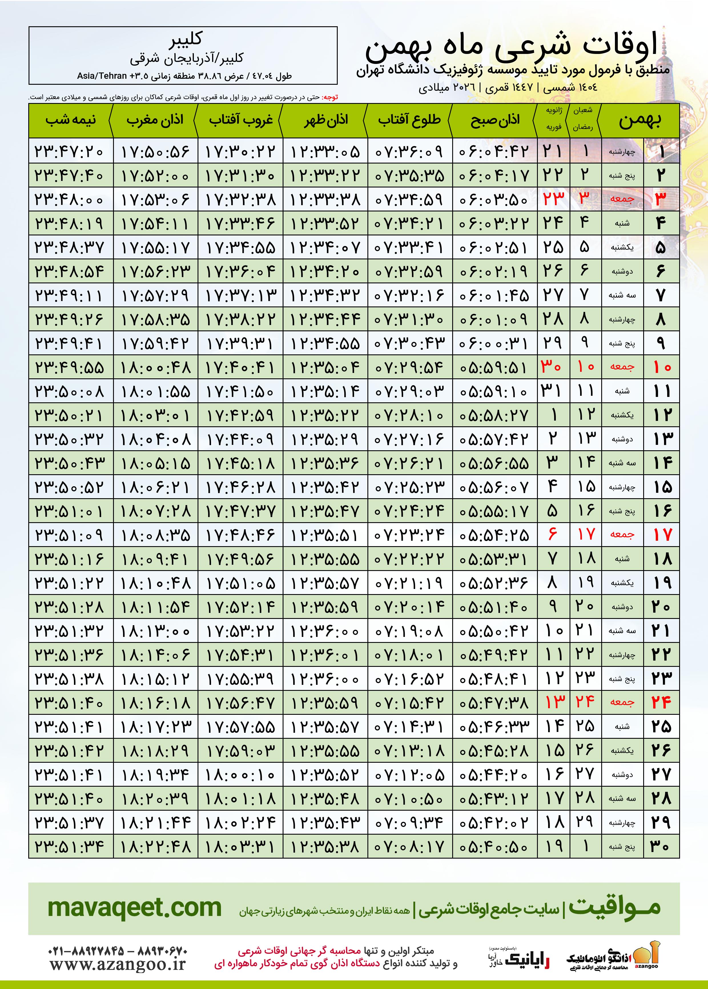 دانلود اوقات شرعی بهمن ٠٤ - ١٤٠٤ شهر کلیبر