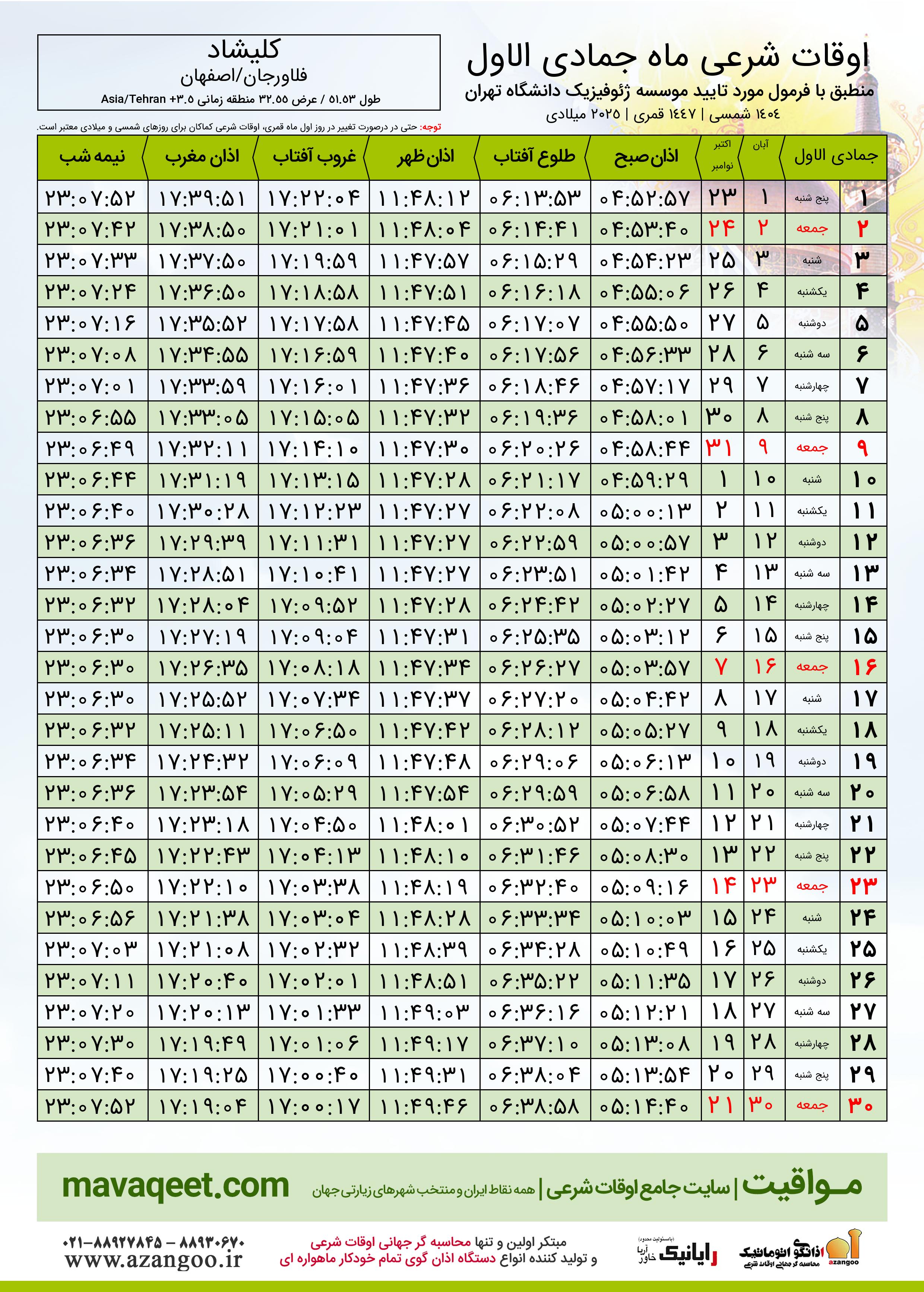 جدول اوقات شرعی جمادی الاول ١٤٤٧ قمری شهر کلیشاد