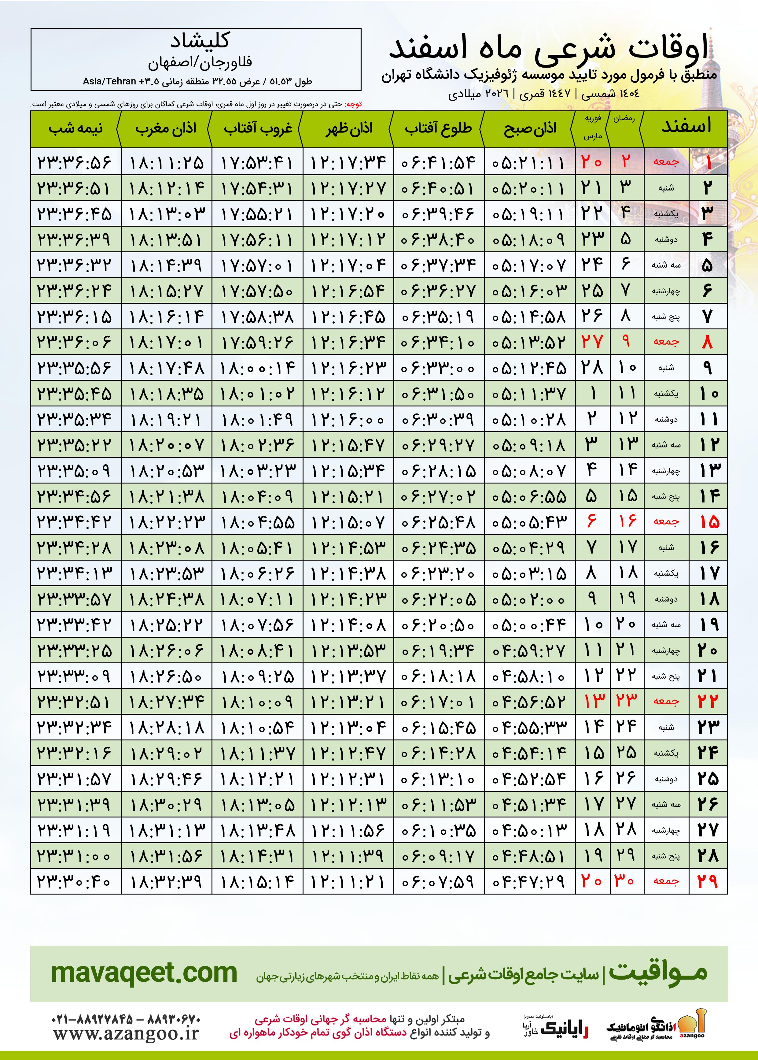 اوقات شرعی ماه رمضان شهر کلیشاد ١٤٠٤ - ٠٤ شمسی | ٢٠٢٦ میلادی