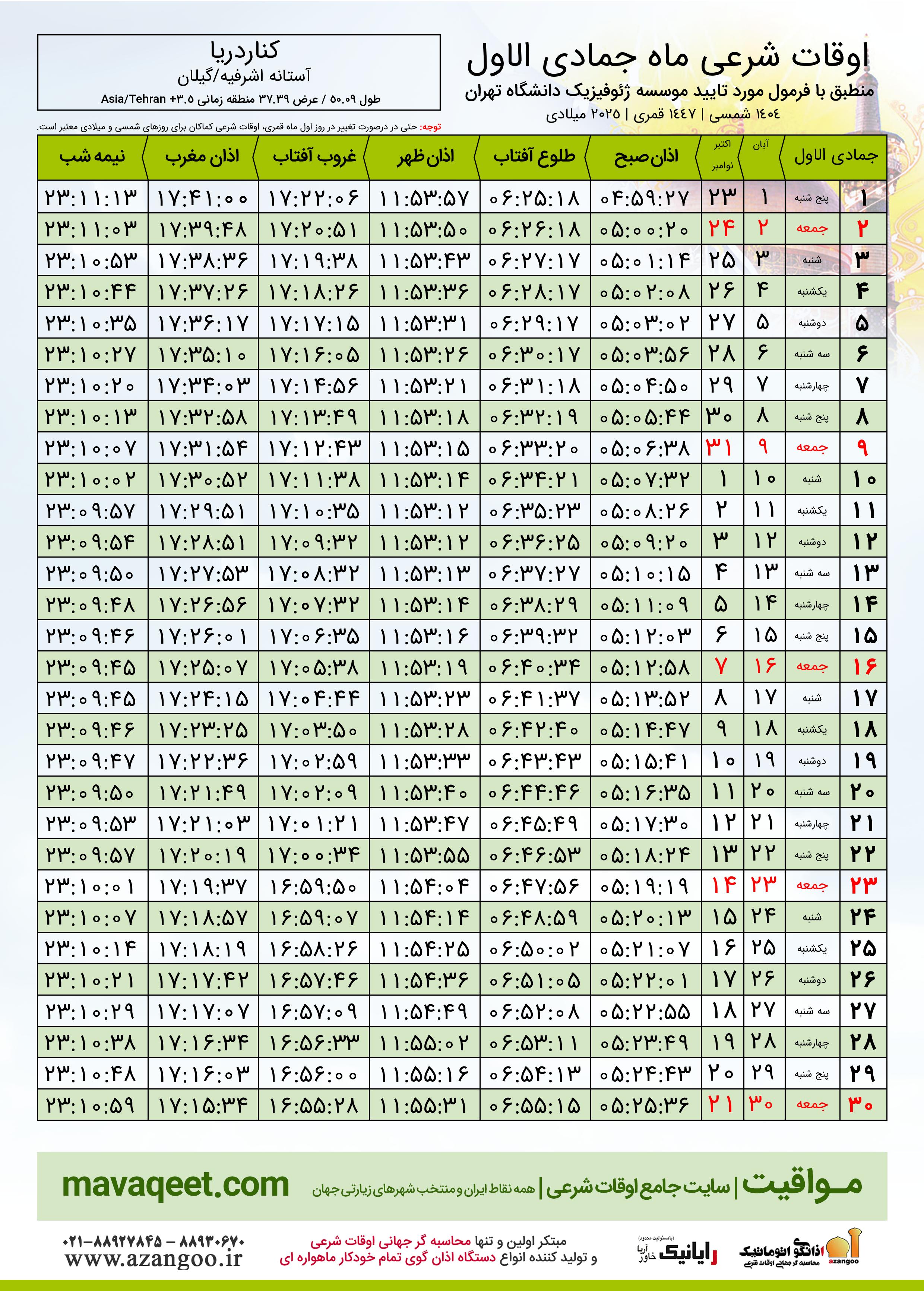اوقات شرعی ماه جمادی الاول ١٤٤٧ هـ.ق شهر کناردریا بر