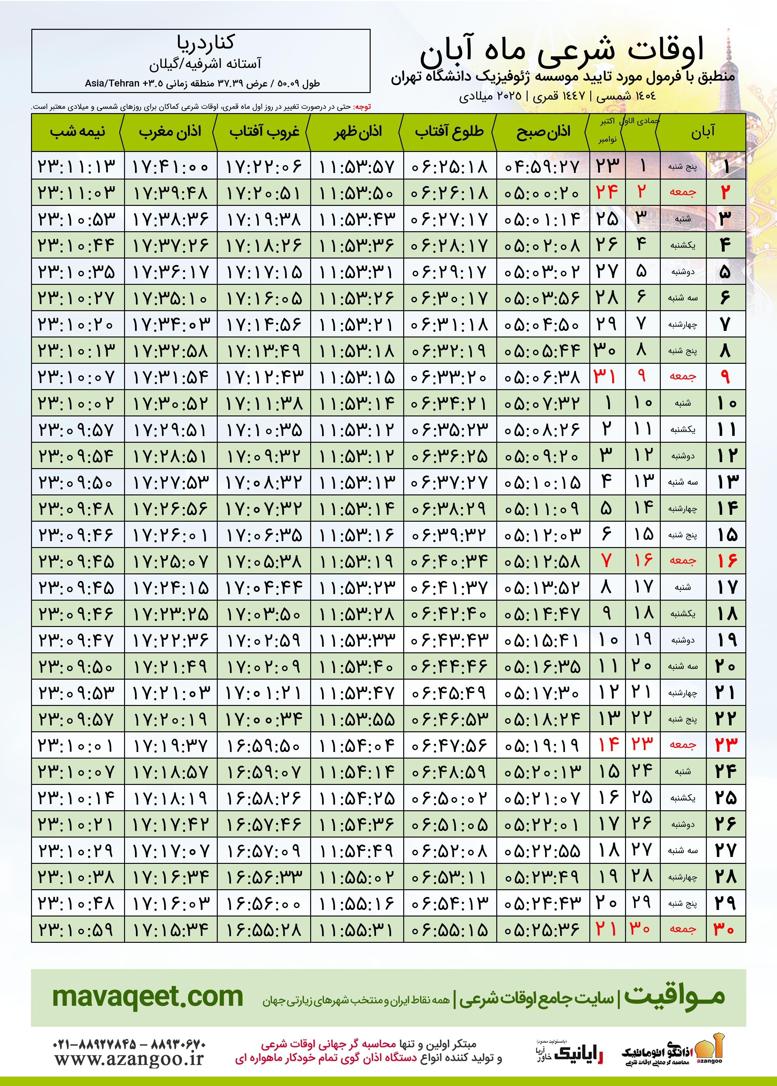 جدول اوقات شرعی آبان ١٤٠٤ شمسی شهر کناردریا