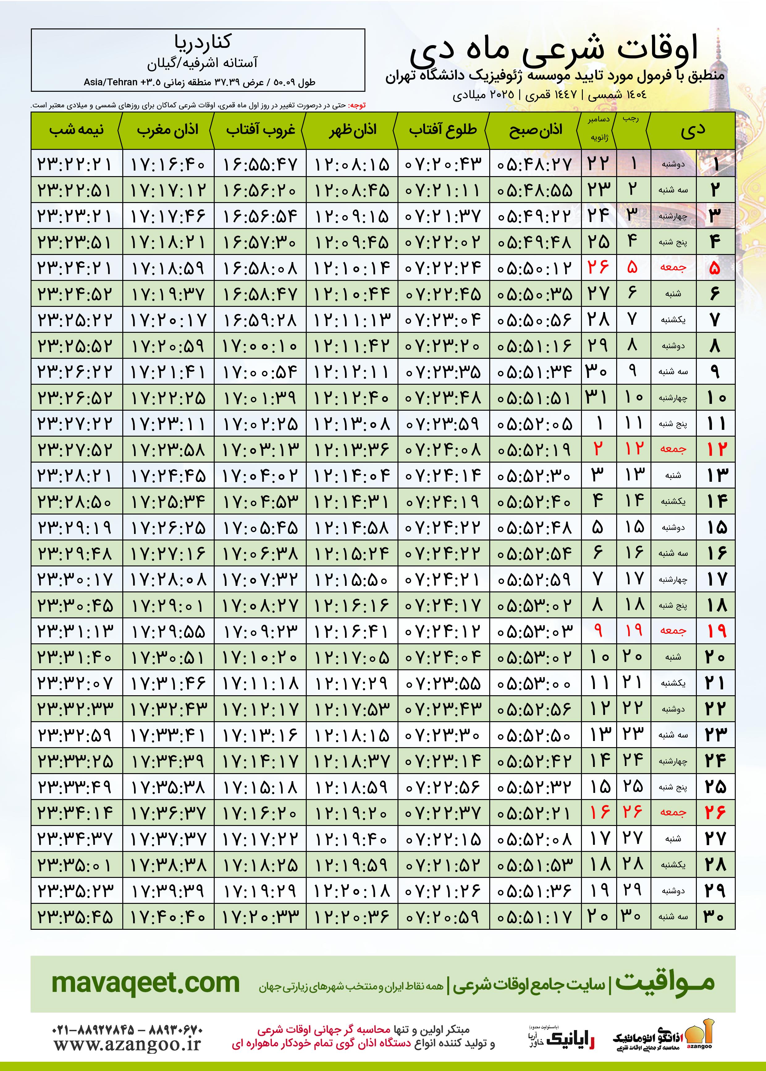 جدول اوقات شرعی دسامبر ٢٠٢٥ میلادی شهر کناردریا