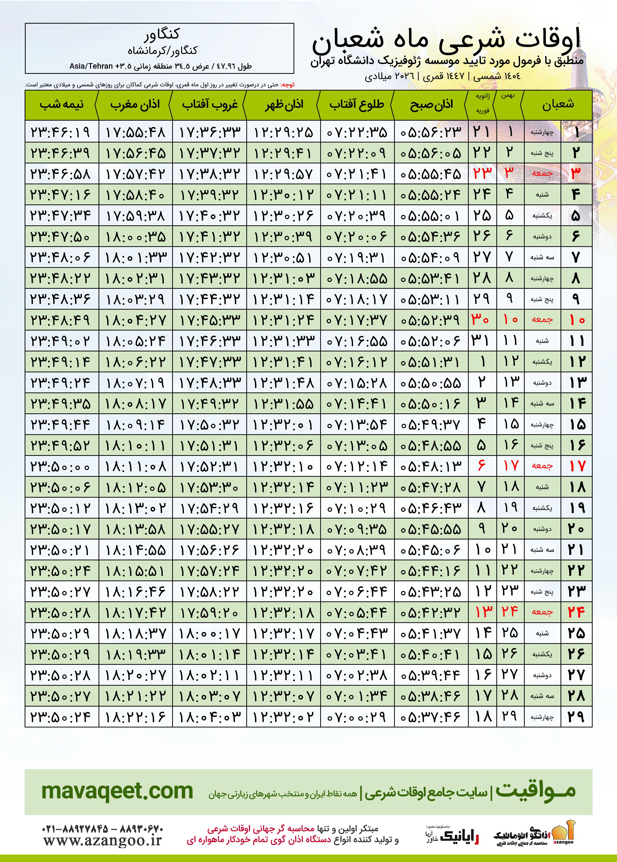 اوقات شرعی ماه شعبان ١٤٤٧ هـ.ق شهر کنگاور بر