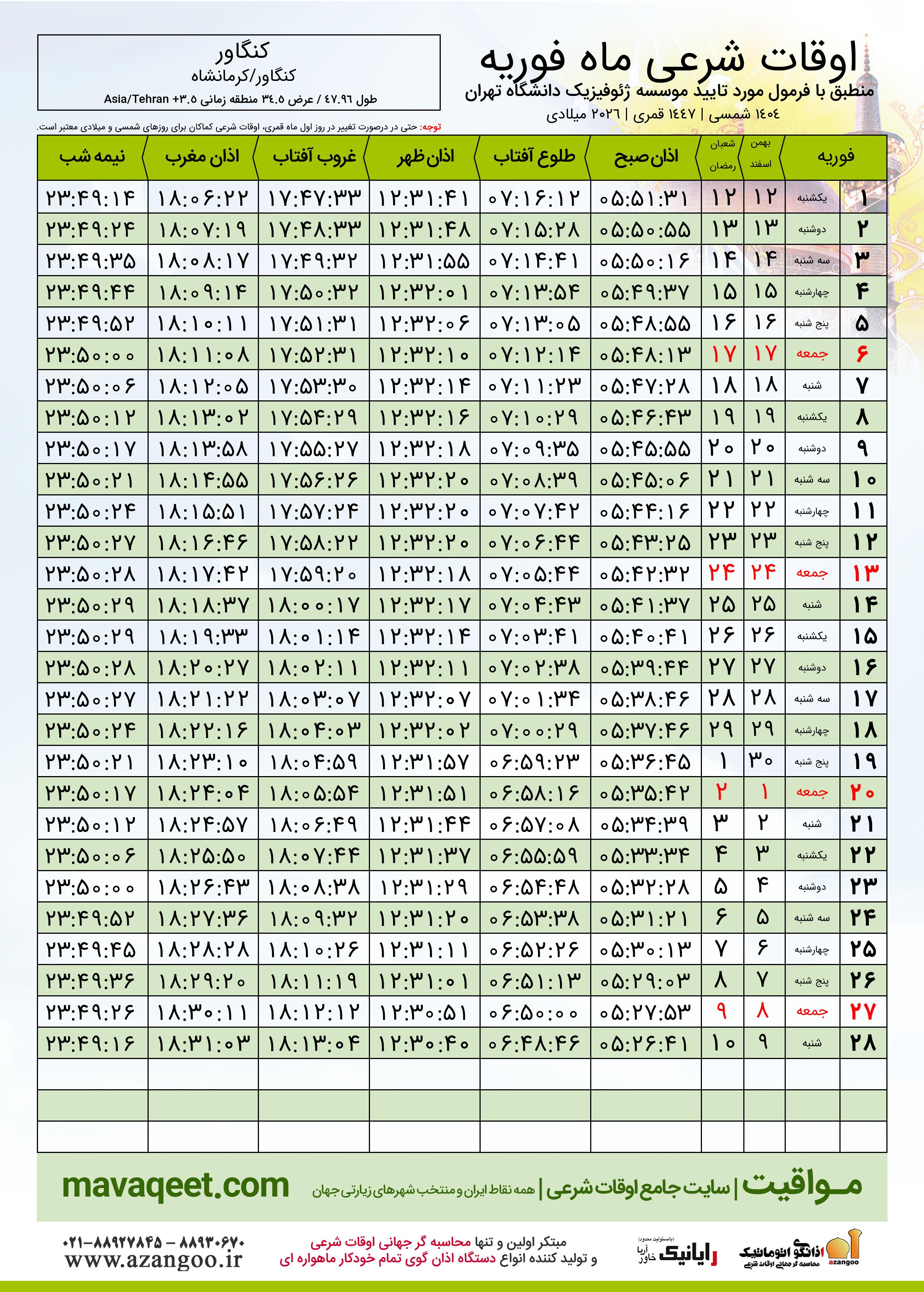 جدول اوقات شرعی ماه رمضان شهر کنگاور ٠٤ - ١٤٠٤ شمسی | ٢٠٢٦ میلادی | ١٤٤٧ قمری